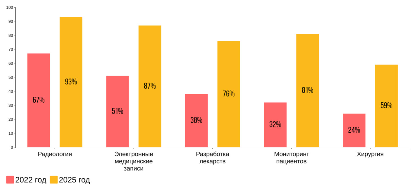 По данным Accenture, под конец 2025 года около 90% всех медицинских организаций будут, так или иначе, пользоваться решениями на базе ИИ. Они могут даже этого не осознавать: системы искусственного интеллекта настолько глубоко проникли во все цифровые сервисы, что стали таким же обыденным делом, как и смартфон в руках каждого рядового пациента.