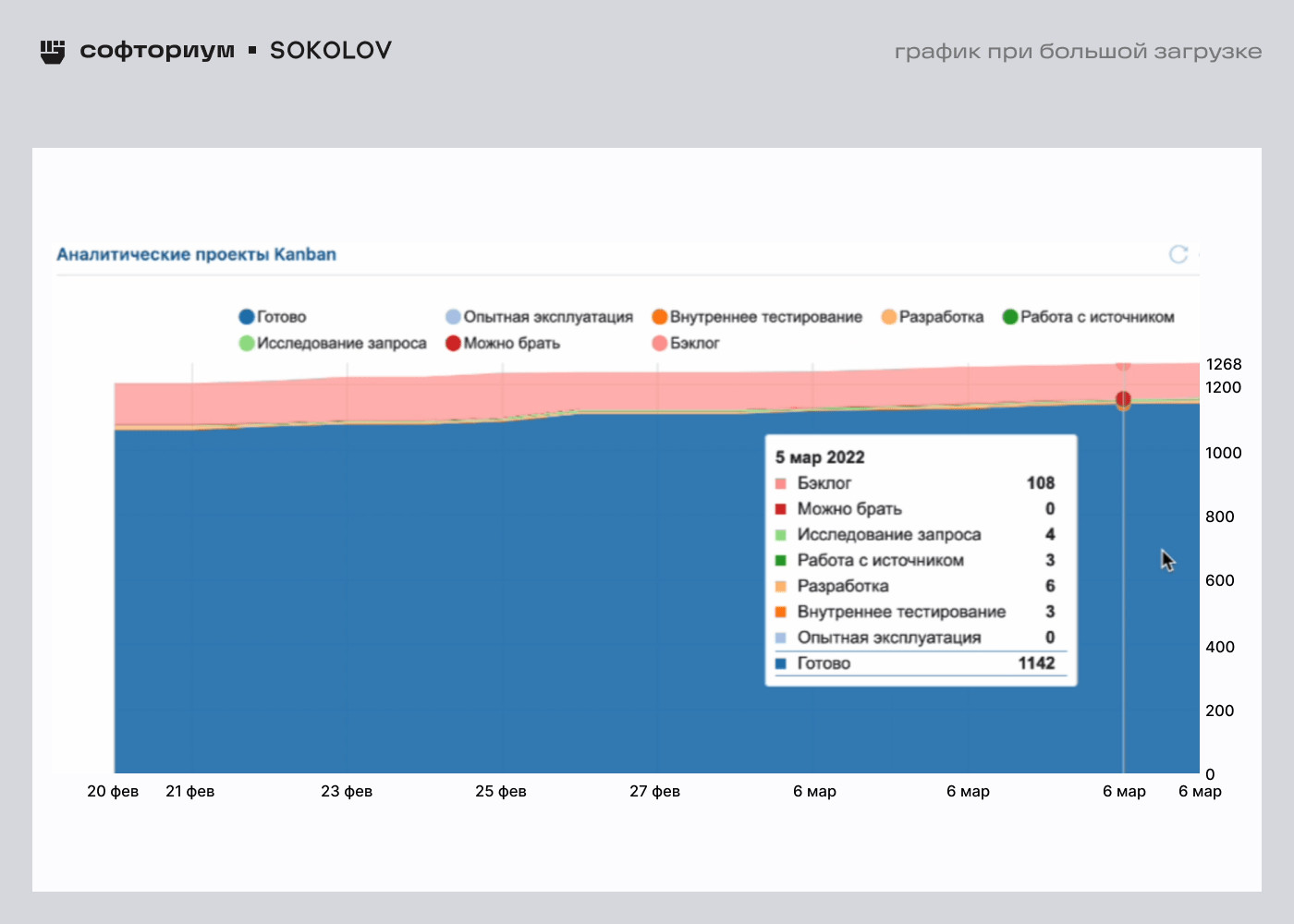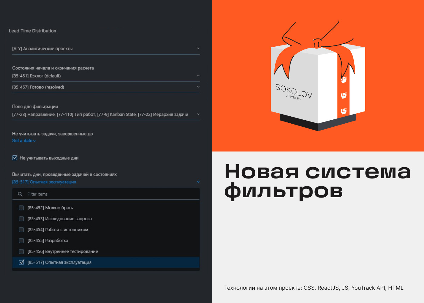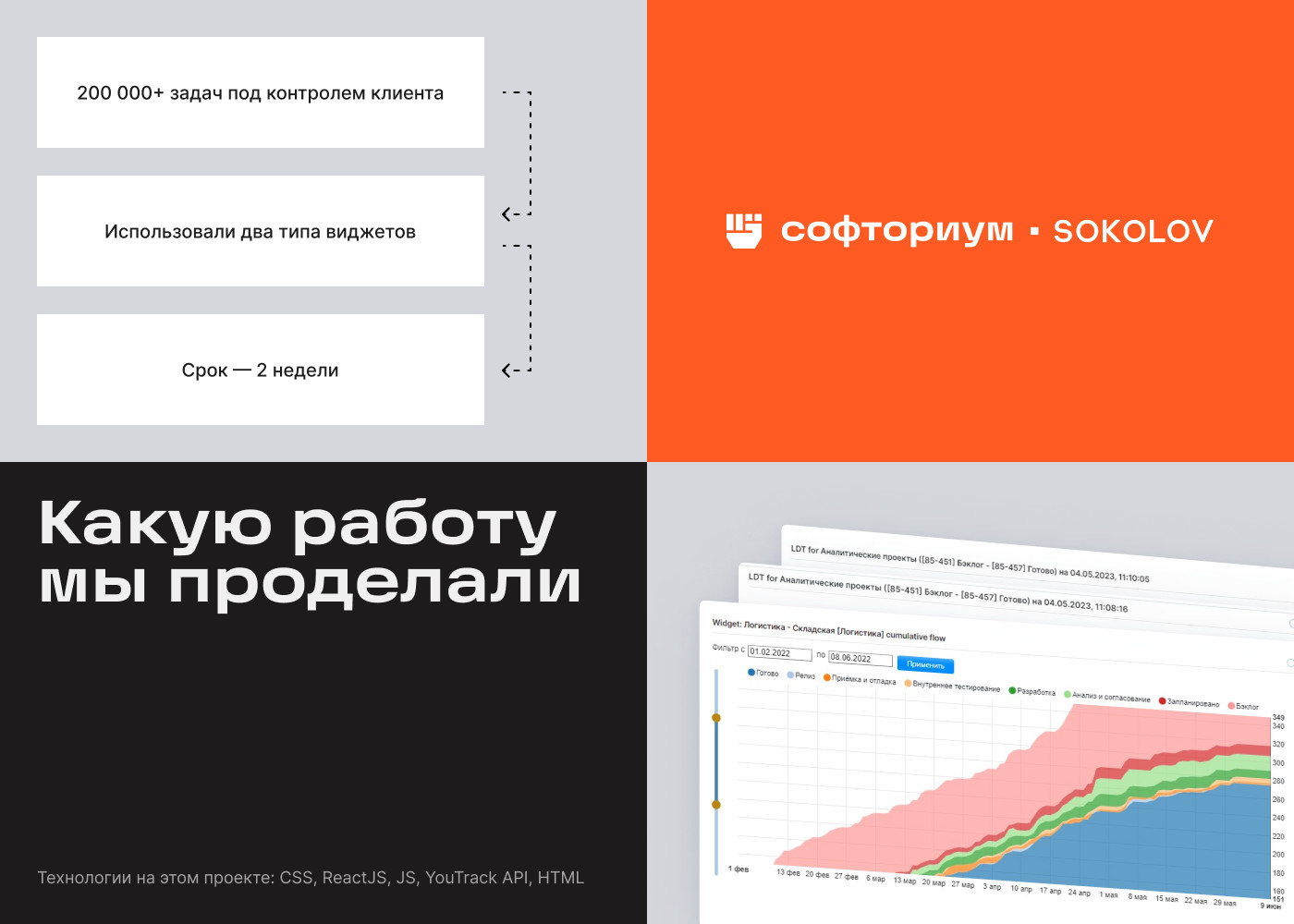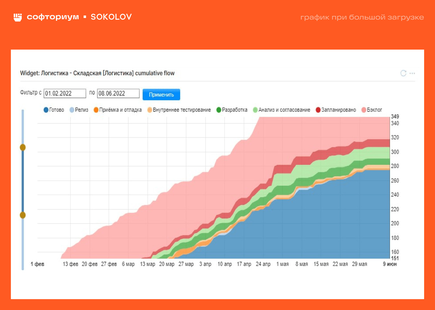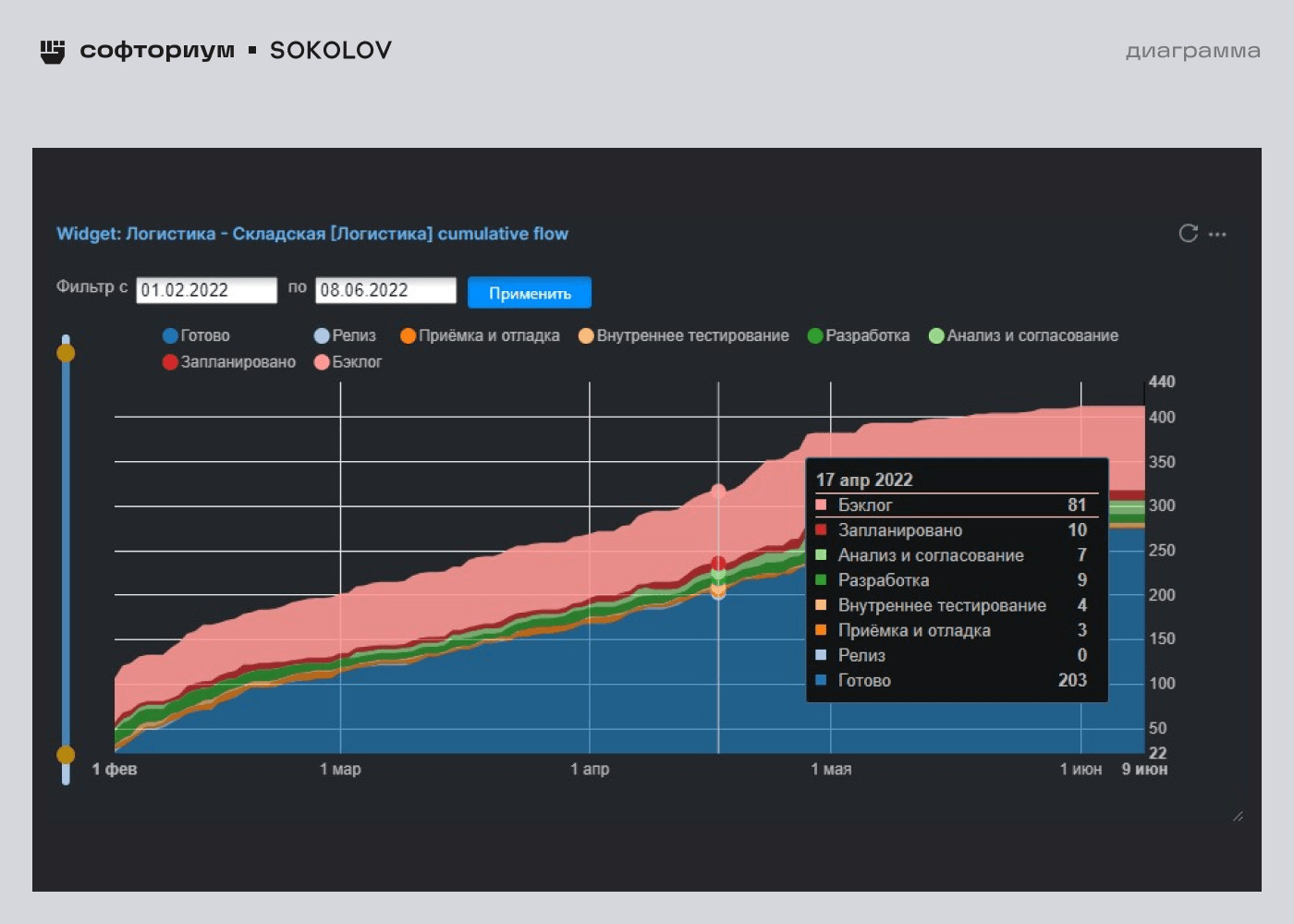 Чтобы онлайн-каналы работали стабильно, нужно, в том числе, виртуозно управлять внутренними процессами. Но софт, который SOKOLOV использовал для менеджмента своей ИТ-команды, не отвечал требованиям руководства на 100%. Нам нужно было помочь клиенту настроить инструмент под задачи менеджеров. Для управления проектами клиент использовал YouTrack. Это довольно мощная и удобная программа, но всё-таки — коробочное решение. Вот, представьте, дарят вам ящик с инструментами: такой весь новенький, красивый, укомплектованный. Поначалу кажется, что в нём всё есть. Но стоит какому-то винтику в шкафу открутиться, вы обязательно обнаружите, что нужный шестигранник на 12 мм в наборе отсутствует. С коробочным решением так же: каким бы оно ни было идеальным, порой нужной именно вам функции может не быть. Это и произошло и в случае нашего клиента. Посмотрите на график: Вроде всё наглядно: ось х — даты, ось y — количество задач. Видно, какие задачи в прогрессе, какие в тесте. Но что произойдёт, если попытаться отследить статус не 147 задач, а, скажем, 1268? Наглядность покинет чат: На таком графике отслеживать выполнение задач на проекте сложнее (под фото) Sokolov хотел, чтобы мы усовершенствовали диаграммы, которые были в YouTrack: добавили виджеты с настраиваемой визуализацией и кастомной системой фильтров, чтобы отображение большого массива данных стало наглядным. Проще говоря, клиент хотел, чтобы мы положили в его ящик с инструментами недостающие шестигранники. В чём польза кумулятивных диаграмм То, что мы делали, на техническом языке называется Cumulative Flow Diagram, или CFD — накопительная диаграмма потока. Такие диаграммы используют, чтобы отслеживать, как идёт проект, и прогнозировать его развитие. Клиент показал нам интерфейс виджета, в котором было всё, чего ему не хватало в YouTrack. Эта та же самая кумулятивная диаграмма, но уже с нужными функциями: Готовых виджетов, чтобы сделать так, как хотел клиент, не было, поэтому нам пришлось писать свои. Сейчас расскажем, через что мы прошли. Методика у нас выверенная. План A: изучаем доступную функциональность инструмента, чтобы проверить, можно ли внести изменения без вмешательства в код. Если можно — вносим. Если нельзя — подключаем план B: анализируем, что нужно добавить в код, и добавляем. В YouTrack нельзя было ни усовершенствовать диаграмму, ни получить необходимые данные для отображения на ней в готовом виде, поэтому нам пригодился план B. Создание виджета для готовой системы — классная задача для разработчиков. Ты изучаешь устройство готового инструмента и дополняешь его своим (!) кодом. Это как если бы Микеланджело Буонарроти предложил молодому художнику сделать пару взмахов кисти где-то в районе его «Сотворения Адама». Вдохновляет, но есть нюанс. Документацию YouTrack нельзя назвать исчерпывающей. Создание виджетов в базовом виде в ней описано, но все тонкости не указаны. Так в документации не оказалось описания нужных нам методов API. И нам пришлось методом проб и ошибок разбираться в том, как YouTrack передаёт данные. Ситуация, когда на какой-то объём функциональности документации нет, встречается почти на каждом проекте. К сожалению, мы не преувеличиваем. Но у такой частотности есть и хорошая сторона — мы к этому готовы. В классическом режиме, когда документация есть, мы просто читаем её и понимаем, какой параметр передать, чтобы получи