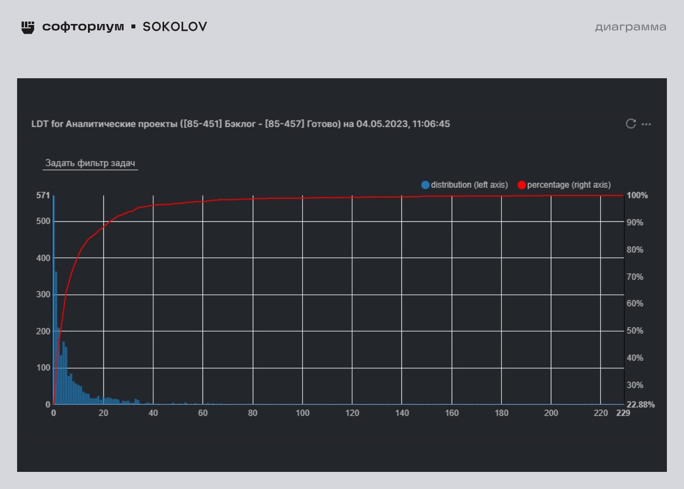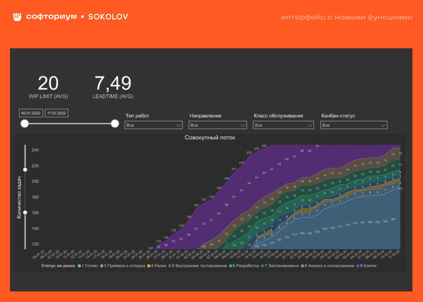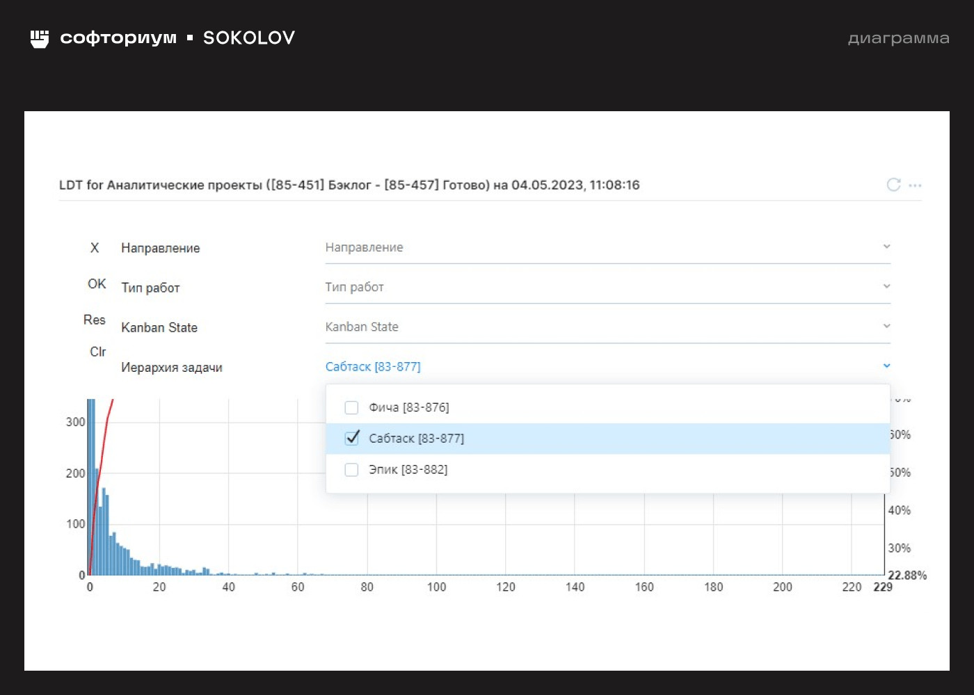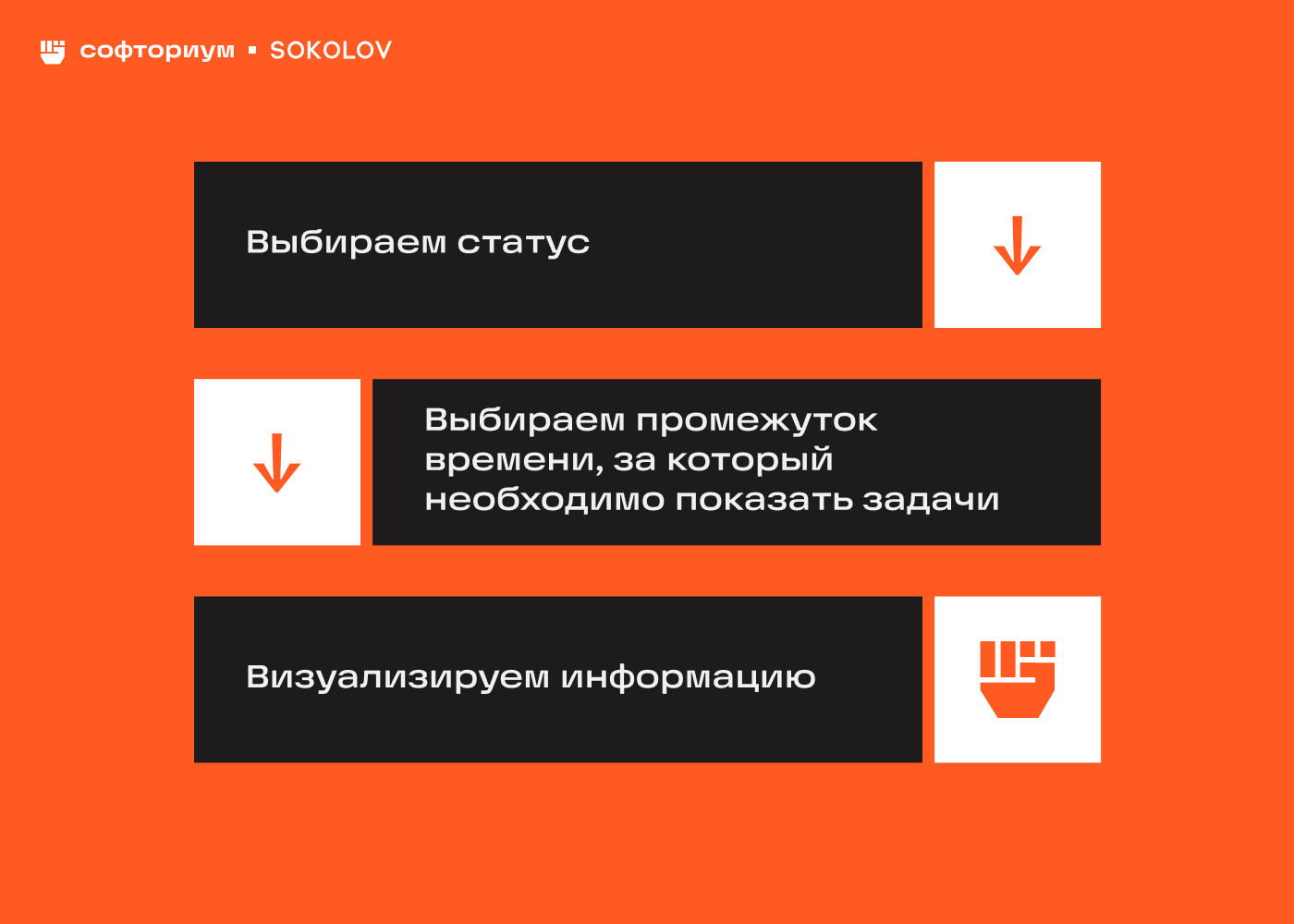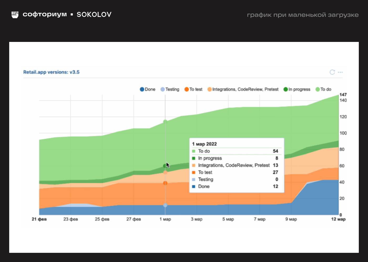 Чтобы онлайн-каналы работали стабильно, нужно, в том числе, виртуозно управлять внутренними процессами. Но софт, который SOKOLOV использовал для менеджмента своей ИТ-команды, не отвечал требованиям руководства на 100%. Нам нужно было помочь клиенту настроить инструмент под задачи менеджеров. Для управления проектами клиент использовал YouTrack. Это довольно мощная и удобная программа, но всё-таки — коробочное решение. Вот, представьте, дарят вам ящик с инструментами: такой весь новенький, красивый, укомплектованный. Поначалу кажется, что в нём всё есть. Но стоит какому-то винтику в шкафу открутиться, вы обязательно обнаружите, что нужный шестигранник на 12 мм в наборе отсутствует. С коробочным решением так же: каким бы оно ни было идеальным, порой нужной именно вам функции может не быть. Это и произошло и в случае нашего клиента. Посмотрите на график: Вроде всё наглядно: ось х — даты, ось y — количество задач. Видно, какие задачи в прогрессе, какие в тесте. Но что произойдёт, если попытаться отследить статус не 147 задач, а, скажем, 1268? Наглядность покинет чат: На таком графике отслеживать выполнение задач на проекте сложнее (под фото) Sokolov хотел, чтобы мы усовершенствовали диаграммы, которые были в YouTrack: добавили виджеты с настраиваемой визуализацией и кастомной системой фильтров, чтобы отображение большого массива данных стало наглядным. Проще говоря, клиент хотел, чтобы мы положили в его ящик с инструментами недостающие шестигранники. В чём польза кумулятивных диаграмм То, что мы делали, на техническом языке называется Cumulative Flow Diagram, или CFD — накопительная диаграмма потока. Такие диаграммы используют, чтобы отслеживать, как идёт проект, и прогнозировать его развитие. Клиент показал нам интерфейс виджета, в котором было всё, чего ему не хватало в YouTrack. Эта та же самая кумулятивная диаграмма, но уже с нужными функциями: Готовых виджетов, чтобы сделать так, как хотел клиент, не было, поэтому нам пришлось писать свои. Сейчас расскажем, через что мы прошли. Методика у нас выверенная. План A: изучаем доступную функциональность инструмента, чтобы проверить, можно ли внести изменения без вмешательства в код. Если можно — вносим. Если нельзя — подключаем план B: анализируем, что нужно добавить в код, и добавляем. В YouTrack нельзя было ни усовершенствовать диаграмму, ни получить необходимые данные для отображения на ней в готовом виде, поэтому нам пригодился план B. Создание виджета для готовой системы — классная задача для разработчиков. Ты изучаешь устройство готового инструмента и дополняешь его своим (!) кодом. Это как если бы Микеланджело Буонарроти предложил молодому художнику сделать пару взмахов кисти где-то в районе его «Сотворения Адама». Вдохновляет, но есть нюанс. Документацию YouTrack нельзя назвать исчерпывающей. Создание виджетов в базовом виде в ней описано, но все тонкости не указаны. Так в документации не оказалось описания нужных нам методов API. И нам пришлось методом проб и ошибок разбираться в том, как YouTrack передаёт данные. Ситуация, когда на какой-то объём функциональности документации нет, встречается почти на каждом проекте. К сожалению, мы не преувеличиваем. Но у такой частотности есть и хорошая сторона — мы к этому готовы. В классическом режиме, когда документация есть, мы просто читаем её и понимаем, какой параметр передать, чтобы получи