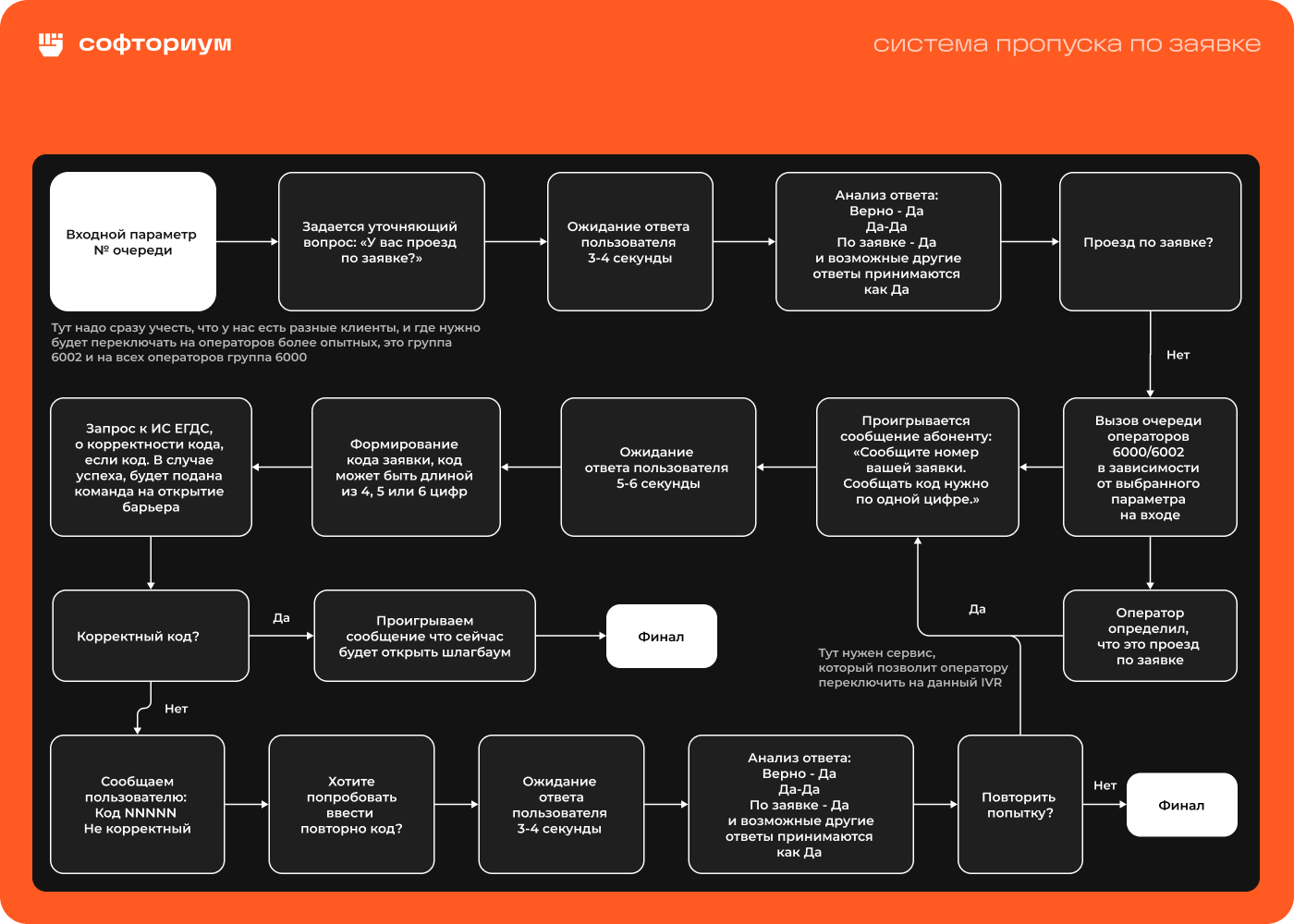 Прежде чем что-то внедрять, мы подробно расписали, как должен работать новый сценарий. Когда клиент звонит в диспетчерскую, система сначала определяет входной параметр — к какой очереди относится звонок. Это важно, потому что у ЕГДС разные группы клиентов, и в некоторых случаях запрос нужно сразу перенаправить более опытным операторам.