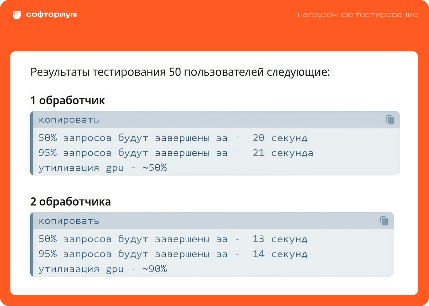 При подтверждении система просит абонента продиктовать номер заявки, а после проверяет его в базе. Если номер корректный, воспроизводится сообщение: «Сейчас будет открыт шлагбаум», и подается команда на открытие. Если неправильный — клиент получает сообщение об ошибке и может попробовать снова. В случае повторного ввода процесс идет по той же цепочке: система снова ждет голосовой ответ, распознает его и проверяет. Если система определяет, что речь все же идет о проезде по заявке, но автоматический сценарий выполнить не удается, оператор может переключить абонента на IVR (интерактивный голосовой модуль). Ну а дальше процесс продолжается в том же режиме, как если бы все шло автоматически. У заказчика за телефонию отвечал Asterisk — система для IP-звонков с открытым кодом. «Открытый код» означает, что любая компания или разработчик может подстроить систему телефонии под себя: добавить новые функции, интегрировать с другими сервисами или изменить логику работы. Для доработки системы на этом этапе хватало базовых знаний Python. Но сложность заключалась в том, что готовых решений под задачу распознавания речи в связке с Asterisk в открытом доступе просто не существовало — поэтому нам пришлось идти путем экспериментов. Первой библиотекой, которую мы взяли на пробу, стала Vosk, и на ее основе мы собрали простую цепочку: Asterisk → AGI-скрипт на Python → Vosk → обработка результата Мы записали короткий аудиофайл, передали его в скрипт и посмотрели, как библиотека справится с распознаванием. По сути, все сработало: Vosk вернул текст, и базовый сценарий оказался реализуемым. Главным показателем оказалось время отклика. Даже в идеальных условиях — на локальной машине, без сети и лишних задержек — Vosk выдавал результат лишь через 6 секунд. Для реального звонка это слишком долго. Пользователь терпит максимум 1–3 секунды задержки, после чего кажется, что диалог завис. Пришлось искать другое решение — такое, которое сможет распознавать речь меньше чем за секунду и не сбоить даже при нагрузке в пятьдесят одновременных звонков. Они на первый взгляд выглядят привлекательно: не нужно ничего настраивать, просто подключи API. Но у них есть два серьезных минуса: 1. Скорость. Передача аудио в облако и обратно дает лишние задержки. Для живого звонка это критично: вместо нужной секунды мы получаем еще большее время отклика. 2. Цена. Облачные сервисы тарифицируются по секундам и количеству запросов. Для постоянного потока звонков выходит слишком дорого. Собственный сервер требует больше усилий: нужно арендовать «железо», настроить CPU/GPU и окружение, развернуть сервис и обернуть его в REST API. Зато это дает два ключевых преимущества: мы полностью контролируем скорость и оптимизацию под свои сценарии, плюс стоимость аренды мощных серверов в долгую оказывается заметно выгоднее, чем платить за облако. Итак, после тестов с Vosk стало понятно: для задачи нужна более тяжелая и быстрая модель. Мы решили попробовать Whisper от OpenAI. Тяжелая и быстрая здесь — отнюдь не антонимы. Если сказать проще: Whisper прожорливее, но умнее. Он требует мощного железа, зато качественнее и быстрее работает под нагрузкой — впрочем, об этом позже. Заказчик арендовал сервер с мощными GPU — именно графические процессоры позволяют обрабатывать речь в реальном времени, тогда как CPU с такой нагрузкой не справляются. На серве