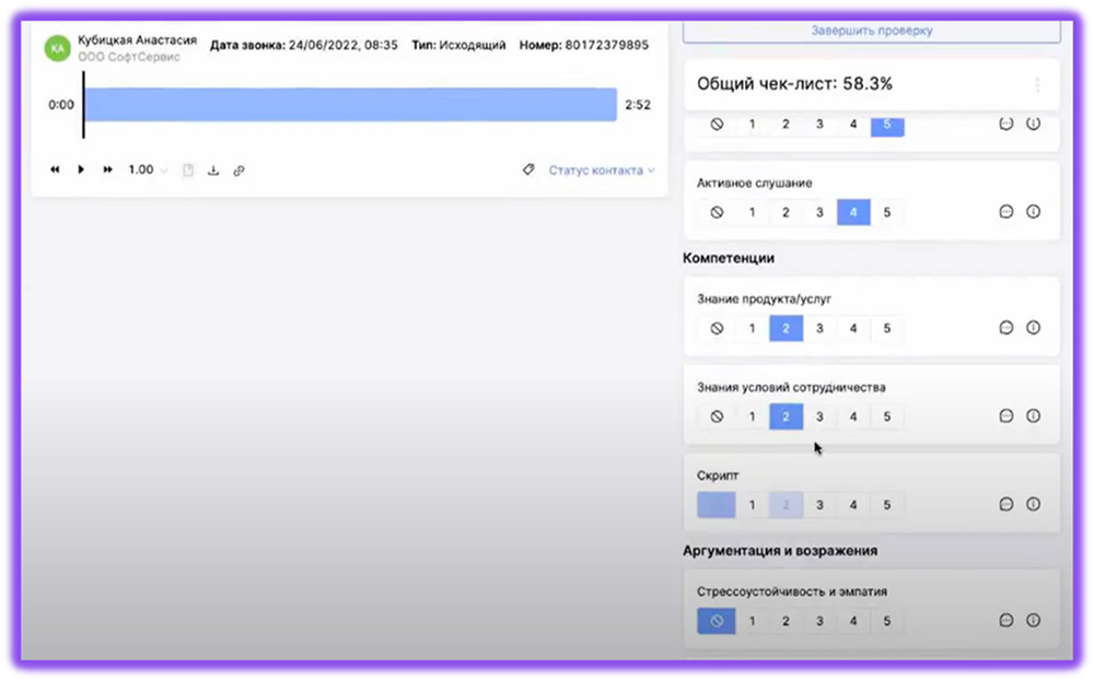консультант прослушивает звонок и оценивает его в специальной форме, данные