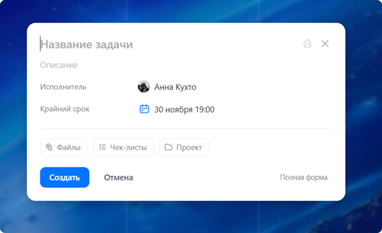В первую очередь, это быстрое создание задачи в упрощенной форме, которая, тем не менее, включает в себя все необходимые и важные параметры.