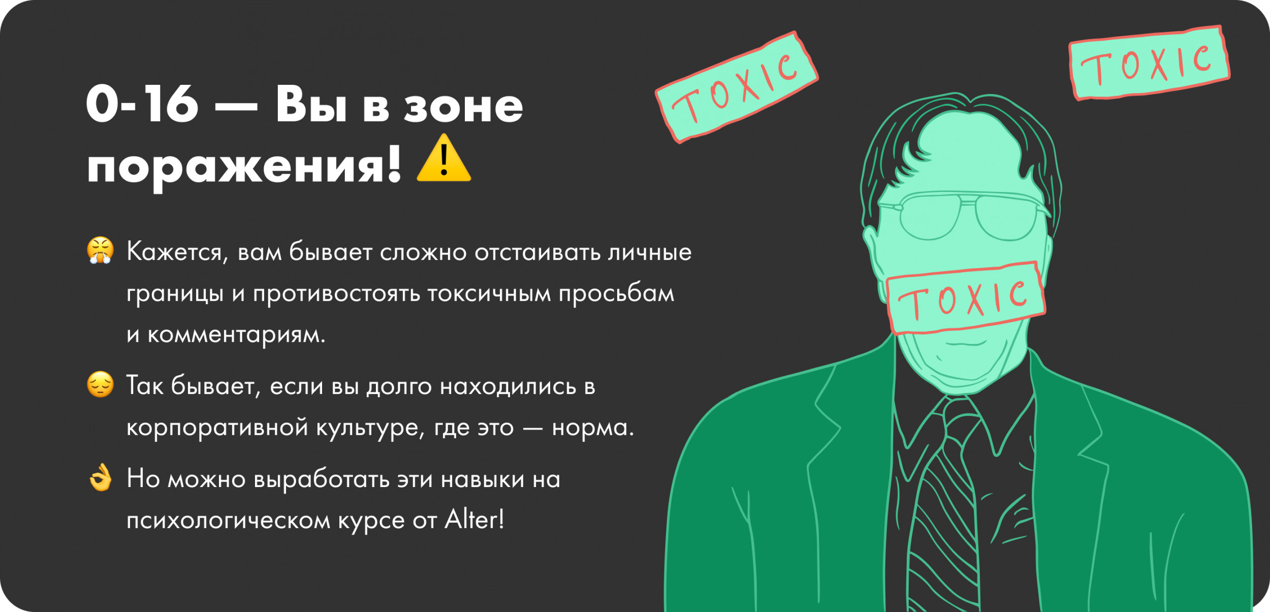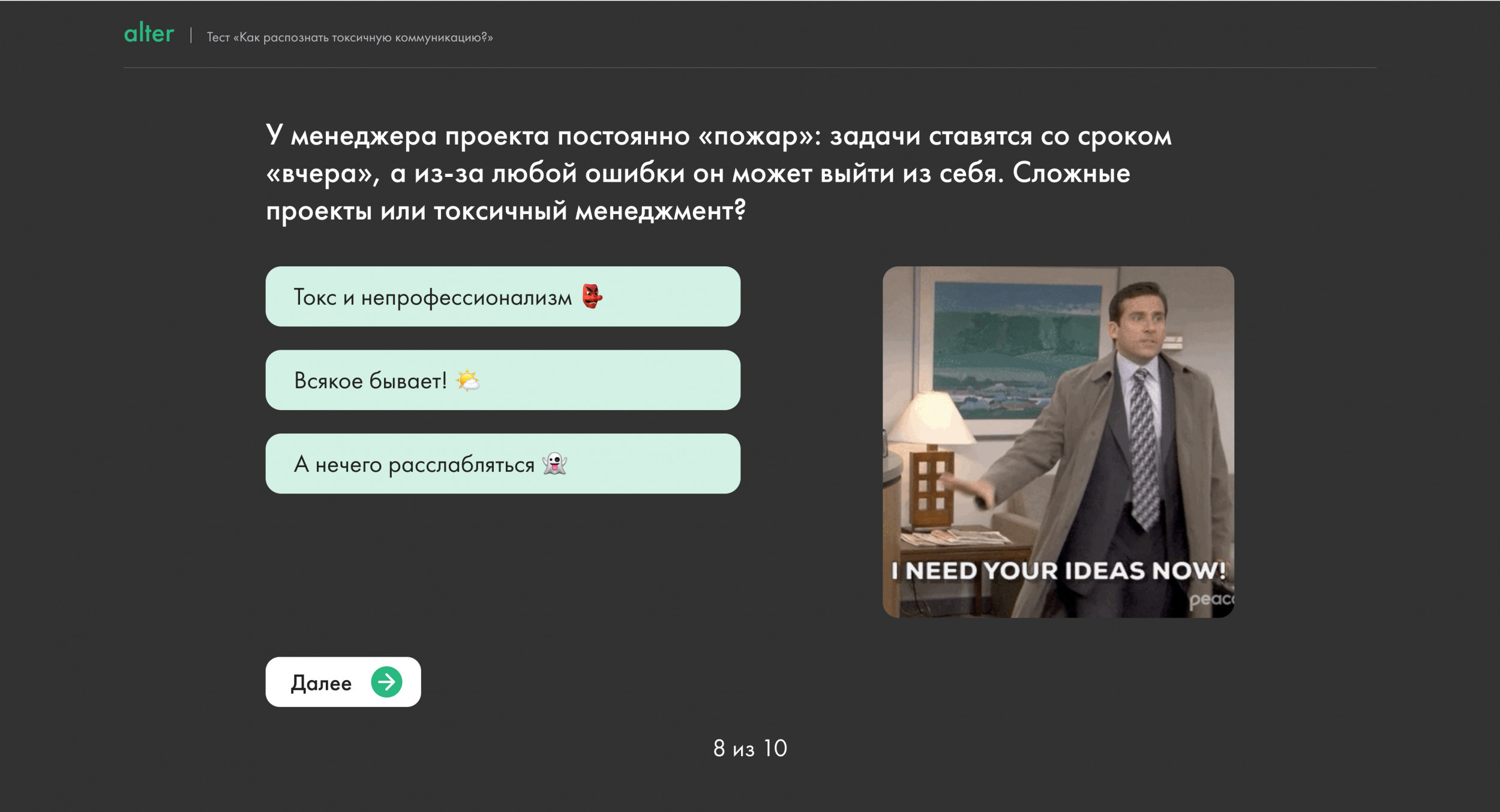 Мы хотели сделать что-то веселое и познавательное на тему коммуникации, которая способна ухудшить рабочий процесс. Это актуальная проблема для многих, не чуждая и нам. И вот мы подумали: почему бы не создать токсик-тест, который помог бы узнать, насколько хорошо люди чувствуют разницу между здоровым и токсичным общением на работе? Чтобы тест был составлен грамотно и давал достоверный результат, который действительно может быть полезен, мы пригласили психологическую платформу Alter стать партнером проекта.