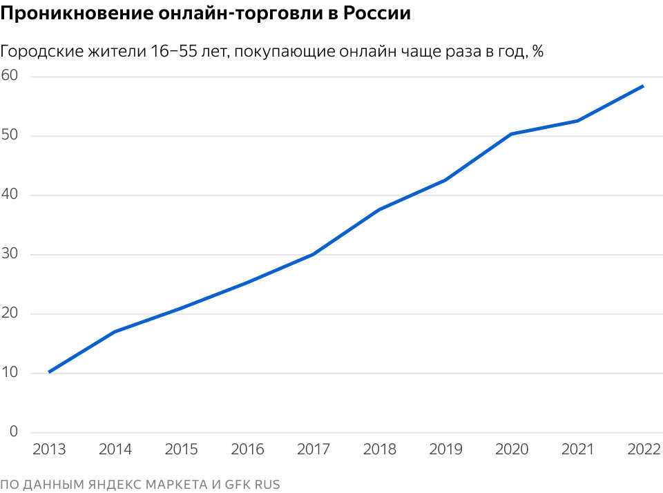 За последние пять лет число онлайн-покупателей в России выросло почти вдвое, сейчас в интернете не реже двух раз в год покупают примерно 60 % городских жителей 16-55 лет. Почти 85 % из них делают заказы минимум раз в месяц, почти 30 % — минимум раз в неделю.