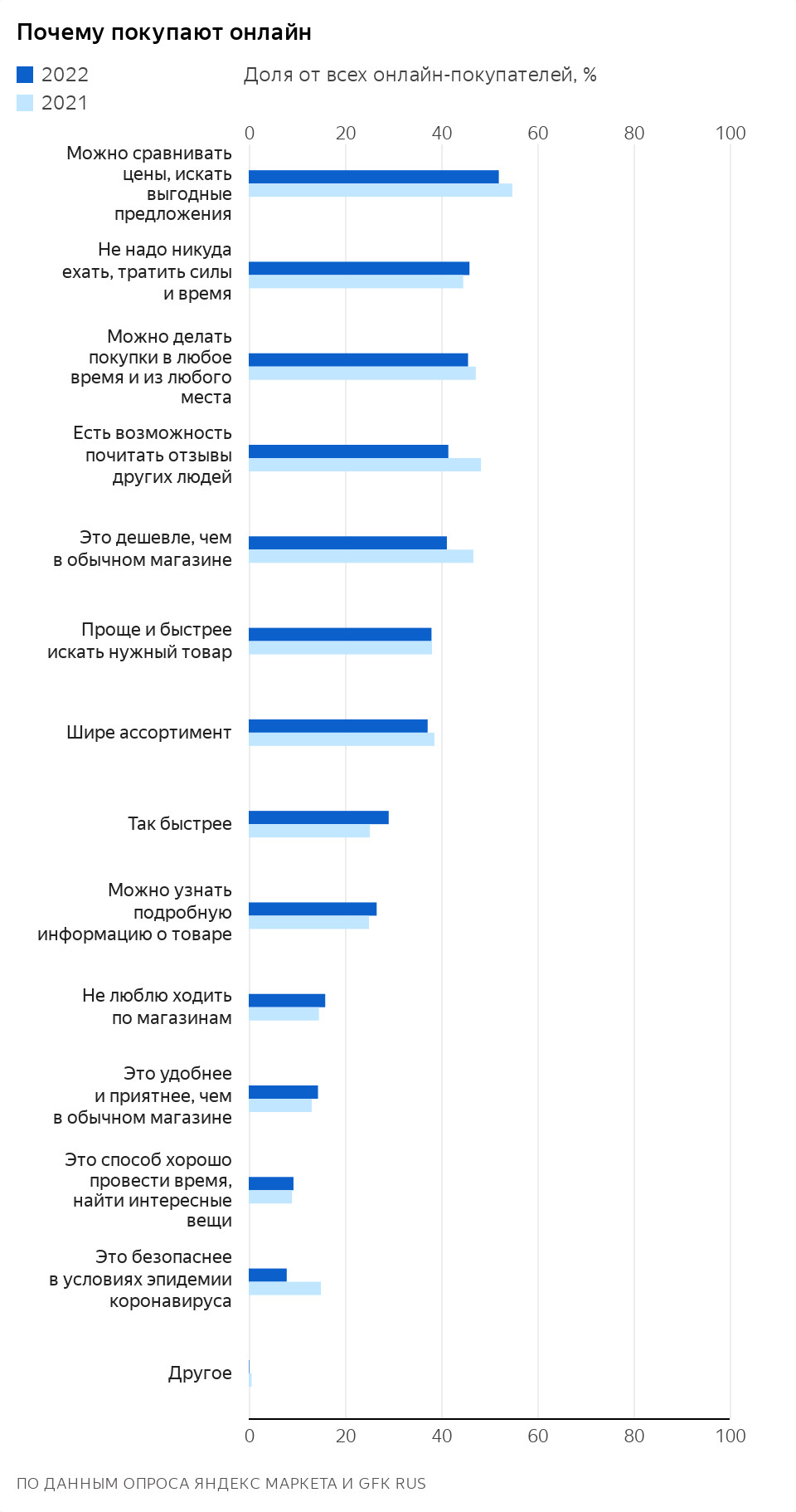 Главные причины покупать онлайн для россиян — возможность сравнить цены, сэкономить силы, которые потребовались бы на поездку в магазин, а также сделать покупку в любое время и из любого места.
