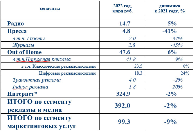 — интернет, радио, пресса, ООН — в 2022 году составил 392 млрд руб., что лишь на 2% меньше, чем годом ранее. С учетом