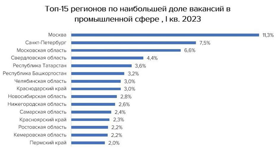 При этом спрос российских промышленных компаний на сотрудников за год увеличился на 58%. Так, к концу марта 2023 года работодатели опубликовали более 400 тыс. вакансий в этой отрасли. Это на 22% больше, чем в последнем квартале 2022 года.
