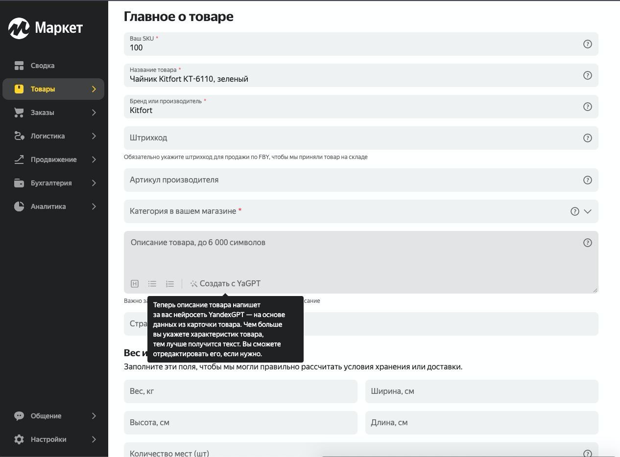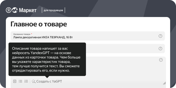 YandexGPT можно использовать для любых карточек, которые продавцы создали в личном кабинете на Маркете. Новая технология уже доступна всем магазинам на сервисе.