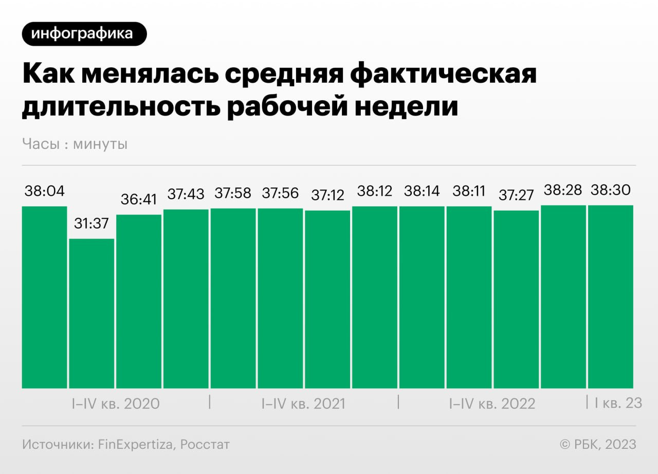 В январе—марте этого года россияне в среднем трудились по 38 часов 30 минут в неделю. За год длительность трудовой пятидневки выросла на четверть часа, достигнув максимального значения по крайней мере с четвертого квартала 2012 года — тогда она составляла 38 часов 29 минут.
