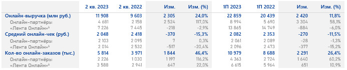 года и составила 96,1% от общего объёма розничных продаж без учета «Утконоса». На долю формата «Гипермаркеты» пришлось 83% общей розничной выручки во втором квартале 2023 года. Продажи формата «Гипермаркеты» увеличились на 4,7% на фоне роста сопоставимых продаж на 4,1% и роста торговой площади на 0,8%. Плотность продаж в гипермаркетах не изменилась по сравнению с аналогичным периодом прошлого года. В июне 2023 года «Лента» открыла гипермаркет в Воронежской области. Общая площадь нового гипермаркета составляет 9 378 квадратных метров, 5 335 квадратных метров занимает торговое пространство. Здание находится в собственности компании. Этот магазин стал первым гипермаркетом, который «Лента» открыла в 2023 году. Во втором квартале 2023 года было открыто 7 новых магазинов малых форматов. «Лента» также закрыла 62 точки, не соответствующих критериям эффективности, в результате чего общее количество магазинов малых форматов составило 513. В отчётном периоде магазины малых форматов продемонстрировали снижение продаж на 6,3%. LFL-продажи магазинов малых форматов снизились на 9,0%, LFL-средний чек — на 8,4%, а LFL-трафик — на 0,7%. Во втором квартале 2023 года общий объём онлайн-продаж