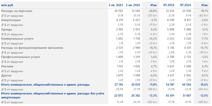 на функционирование магазинов. Во втором квартале 2023 года расходы на оплату труда и соответствующие налоги снизились на 20,8% год к году, а в процентах от выручки — на 231 б.п. Такая динамика связана в основном с повышением эффективности онлайн бизнеса, которое в том числе включало оптимизацию расходов на персонал. Расходы на амортизацию