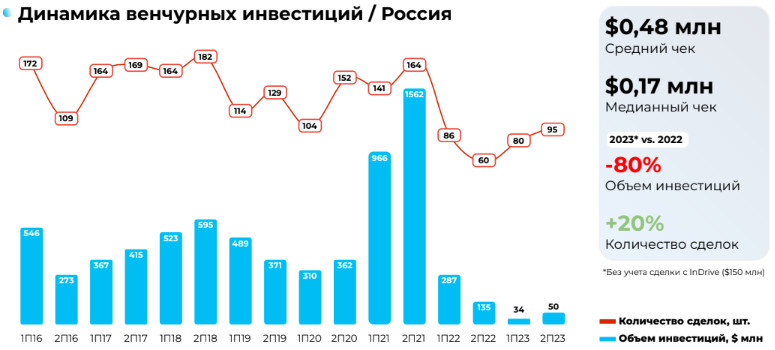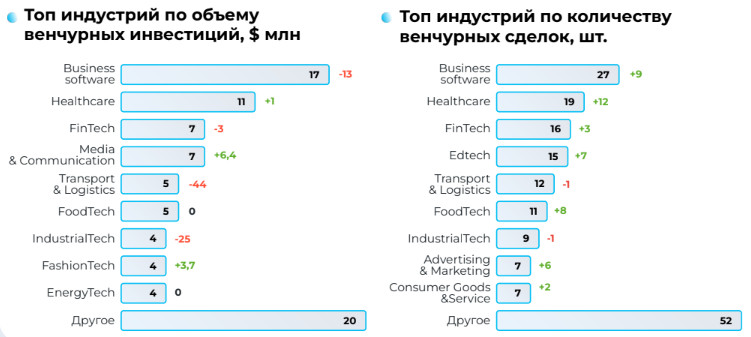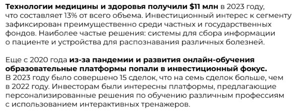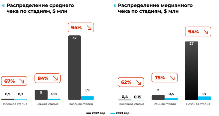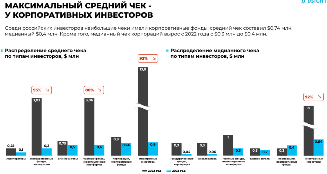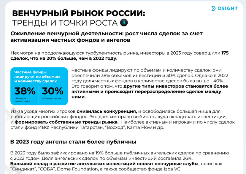 Среди них медицинская платформа на базе ИИ Rosmed ($1,5 млн от неназванной международной инвесткомпании); образовательная платформа Educate Online ($0,64 млн от ангельского клуба UMAY Angel’s Club); а также платформа для создания торговых ботов на криптовалютном рынке Veles.Finance ($0,5 млн от децентрализованного фонда DF101). У инвесторов наблюдается возобновление интереса к HealthCare и EdTech. B2B software (1), HealthCare (2) и FinTech (3) заняли первые три места и по количеству сделок, и по объемам инвестиций. B2B software и FinTech стабильно находятся в топе у российских инвесторов. Особенно интересны эти направления корпорациям, для которых до сих пор актуальна задача импортозамещения. По сравнению с неблагоприятным 2022 годом количество сделок в 2023 году выросло на 20%. Этому способствовали, в том числе, активизация ангельского сообщества через венчурные клубы «Синдикат», Dome Foundation, «СОБА», а также интерес к синдицированным сделкам, которые помогает осуществлять фонд IZBA VC. Тем не менее, объем венчурных инвестиций достиг исторического минимума: $84 млн. Инвесторы еще не готовы вкладывать крупные чеки, так как не видят должного качества стартапов и не могут спрогнозировать будущую отдачу. Доля сделок на посевных стадиях увеличилась на 8 п.п. с 65 до 73%. Это еще раз подтверждает, что стартапов с уже подтвержденной бизнес-моделью не хватает. Тренд на микрочеки затронул все стадии. На ранних размер среднего чека снизился в шесть раз, медианного — в четыре раза. На поздних стадиях падение оказалось еще более значительным: средний и медианный чеки снизились более чем в 15 раз и составили в среднем всего $1,8 млн. Государственные фонды инвестировали только в стартапы посевных и ранних стадий. Такая поддержка молодых стартапов поможет им в будущем улучшить свои продукты и бизнес-модели, благодаря чему инвестиционные чеки могут увеличиться. B2B software остаётся быть востребованным. Сегмент корпоративного ПО привлек 20% всех инвестиций в 2023 году. Из года в год направление входит в топ-5 среди приоритетов инвесторов. Особенно важна эта технологическая вертикаль в условиях импортозамещения для корпораций, которые точечно закрывают свои потребности, переходя на российское ПО. Технологические проекты в области здравоохранения вызвали интерес инвесторов в 2023 году: количество сделок с их участием увеличилось почти втрое с семи до 19. Направление поддерживают, в основном, частные фонды. С полным исследованием венчурного рынка России и стран ближнего зарубежья вы можете ознакомиться на сайте Dsight. Презентация исследования: