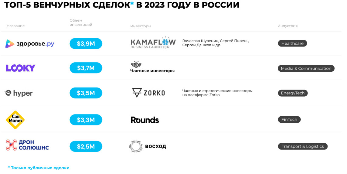 Особый интерес в 2023 году привлекли краудфандинговые платформы, такие как Rounds, Zorko, Brainbox. По оценке Dsight, шесть венчурных сделок было совершено на таких платформах, три из которых — в рамках пре-IPO. Краудфандинговые платформы позволяют розничным инвесторам вкладываться в стартапы микрочеками, что повышает доступность венчурного финансирования в России.