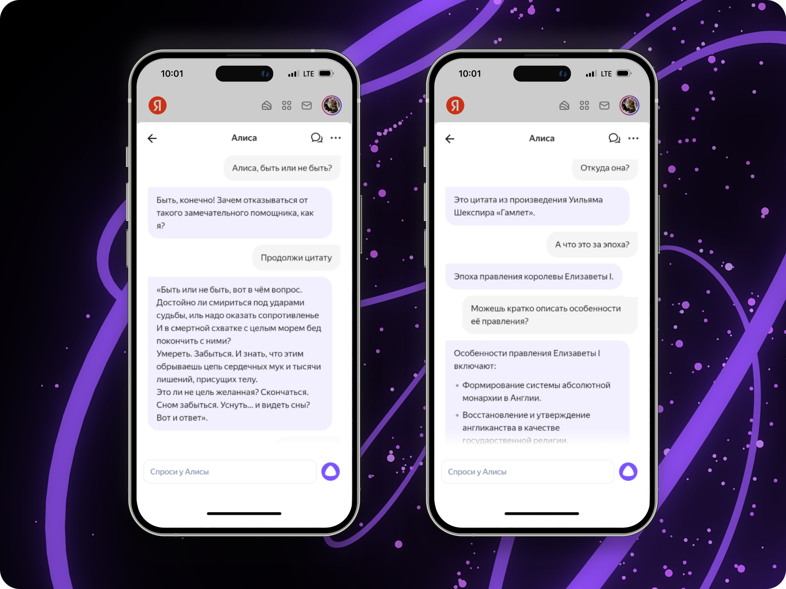 Алиса научилась объяснять сложное простым языком. Например, она расскажет, как возникает торнадо и чем паровой увлажнитель отличается от ультразвукового. В этом ей помогает нейросеть YandexGPT, обученная на огромных массивах информации из интернета. До сих пор Алиса отвечала примерно на 60% вопросов, а в остальных случаях предлагала поискать ответ в интернете или прислать результаты поиска. Сейчас она отвечает на 95% вопросов и может назвать источник информации, если нашла её на сайте.
