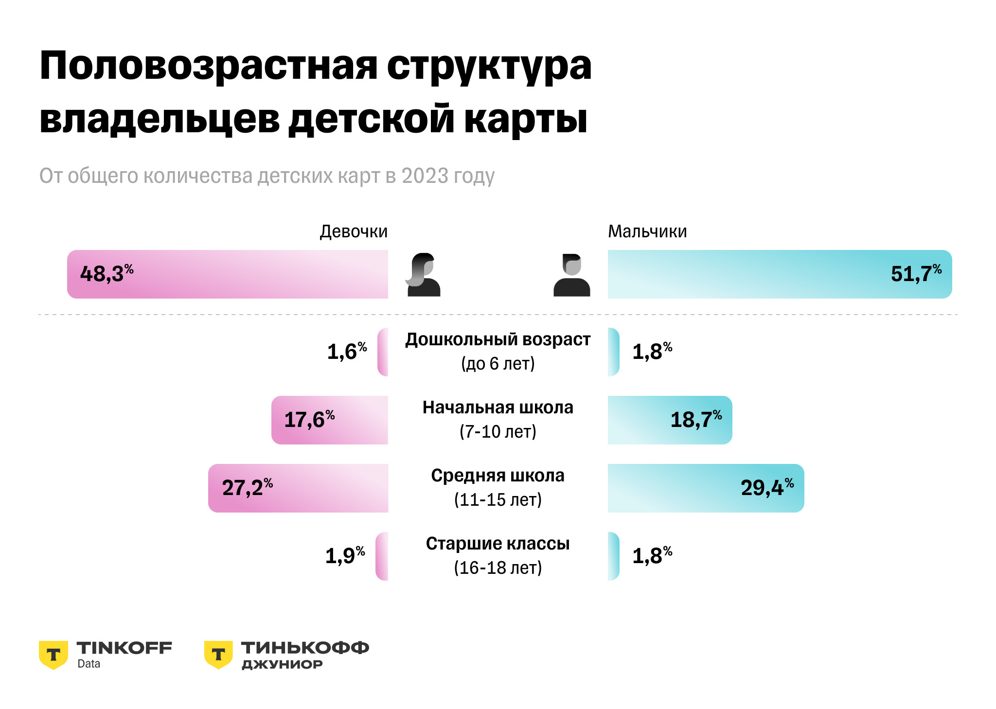 - В 2023 году 51,7% держателей детских карт мальчики, а 48,3% — девочки. Чаще всего детскую карту оформляют 11-летним детям.