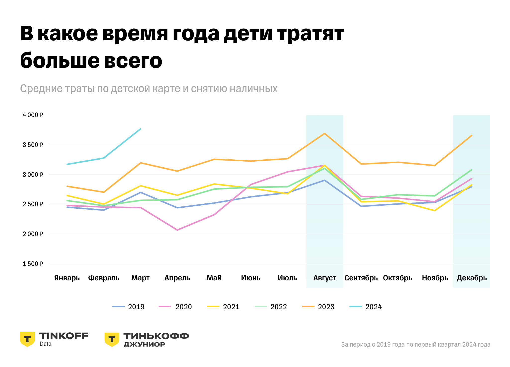 - За пять лет дети стали чаще совершать покупки: в марте 2019 г. — в среднем 10 покупок ежемесячно, в марте 2024 г. — 16 покупок. Расходы за этот период увеличились на 39%.