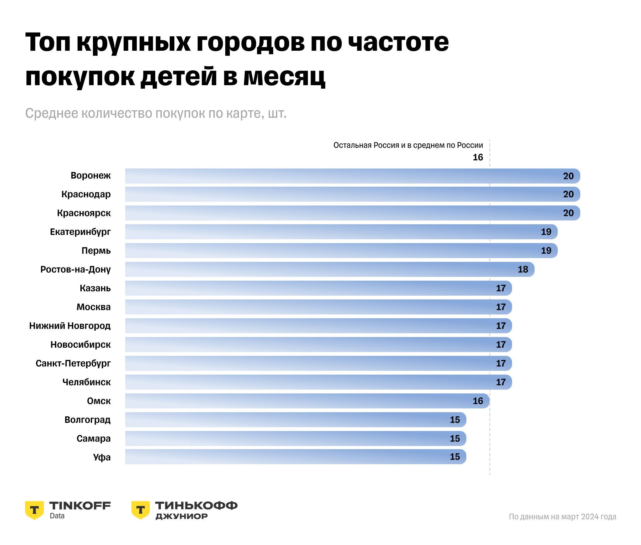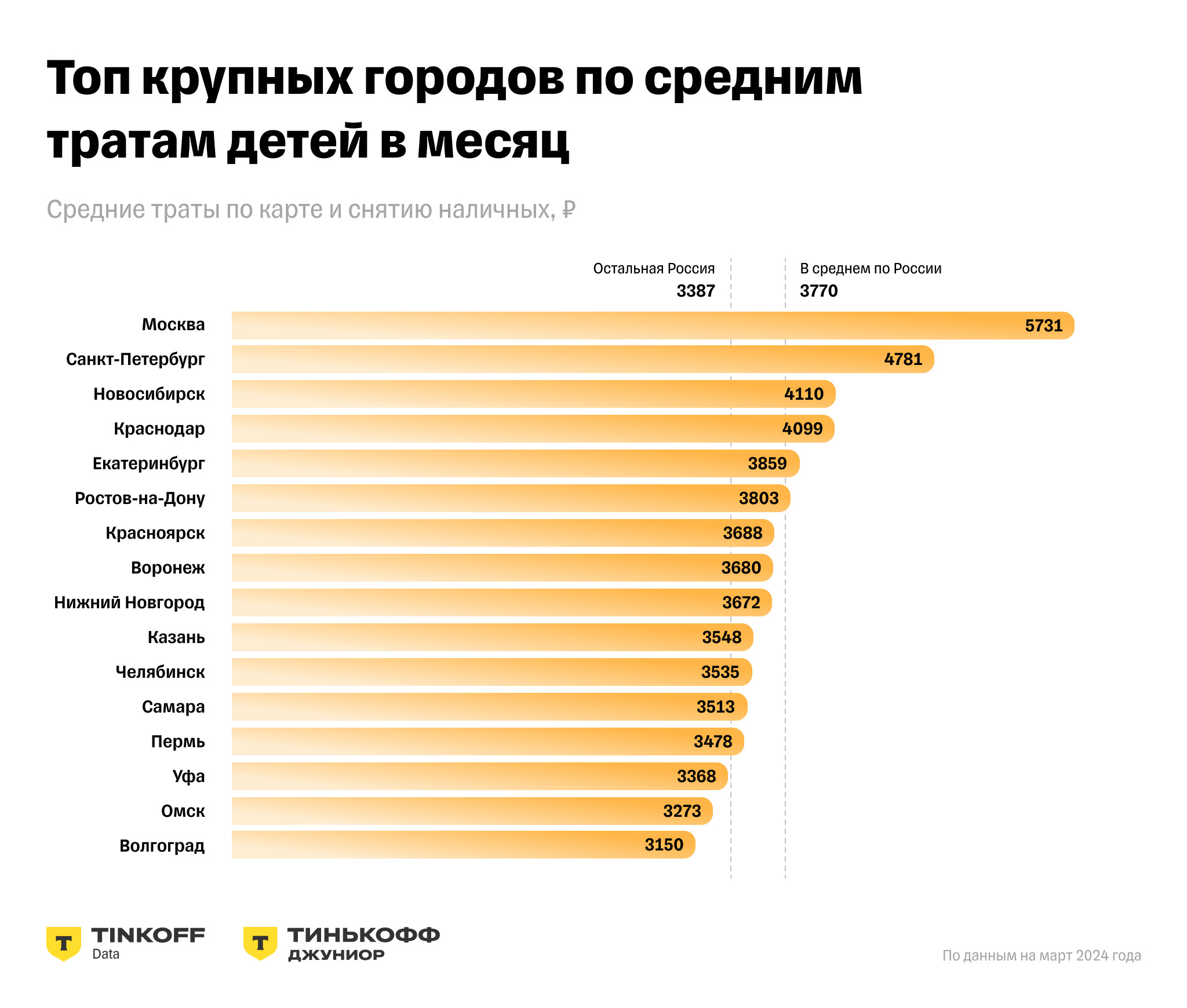 Все чаще детские карты оформляют в различных регионах России. По данным на март 2024 года, две трети их держателей (64,8%) живут за пределами городов-миллионников — в марте 2019 года на эту категорию приходилось 51,1% всех владельцев детских карт. На Москву приходится 10,7% (в 2019 году было 21,4%), еще 5,4% живут в Санкт-Петербурге (было 8,5%) — снижение показателей в этих двух городах связано с ростом количества детей, у которых есть банковские карты, в регионах. Лидерами по средним тратам по детской карте традиционно выступают Москва (5731 руб. в марте 2024 г.), Санкт-Петербург (4781 руб.), третье место занимает Новосибирск (4110 руб.). Однако если смотреть по частоте покупок — то в топ-3 входят Воронеж, Краснодар и Красноярск; в каждом из этих городов по детской карте в марте было совершено в среднем 20 покупок.