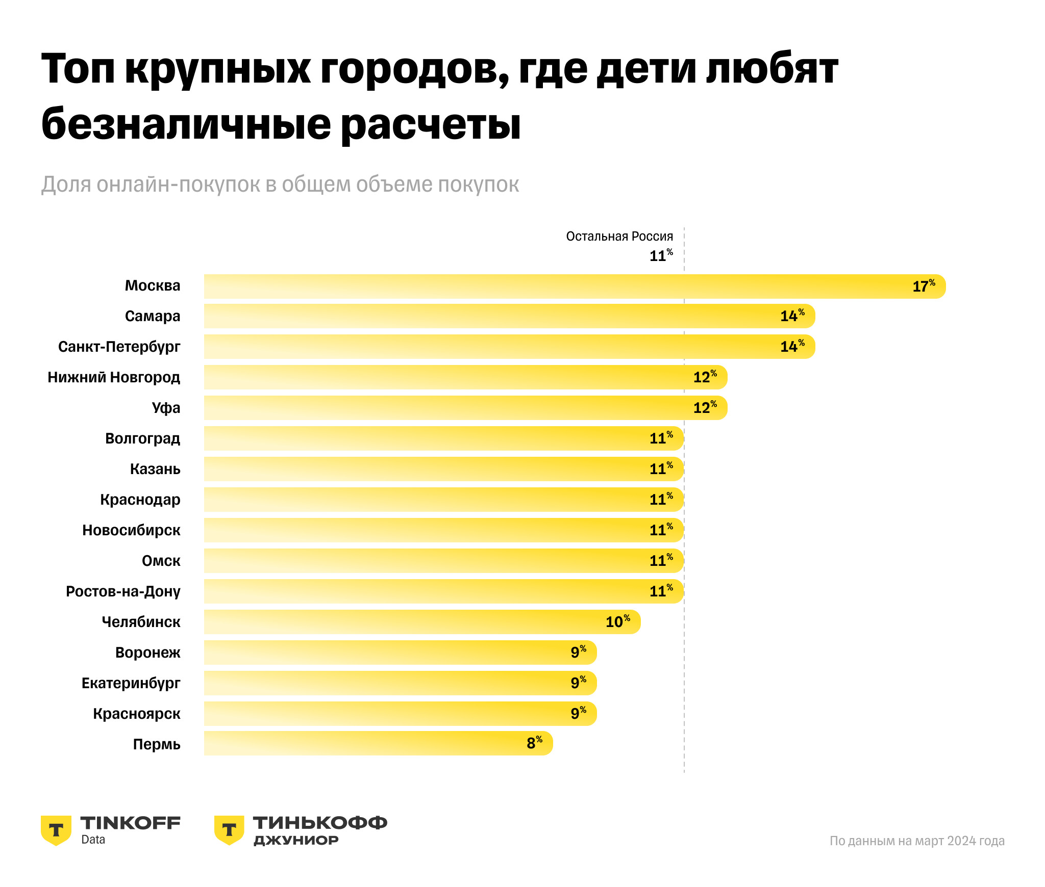 - Дети стали реже пользоваться наличными для оплаты, и с каждым годом доля снятия наличных в общем объеме детских трат сокращается. По данным за март 2024 года, топ-5 городов, где дети чаще всего оплачивают покупки онлайн: Москва, Самара, Санкт-Петербург, Нижний Новгород, Уфа.