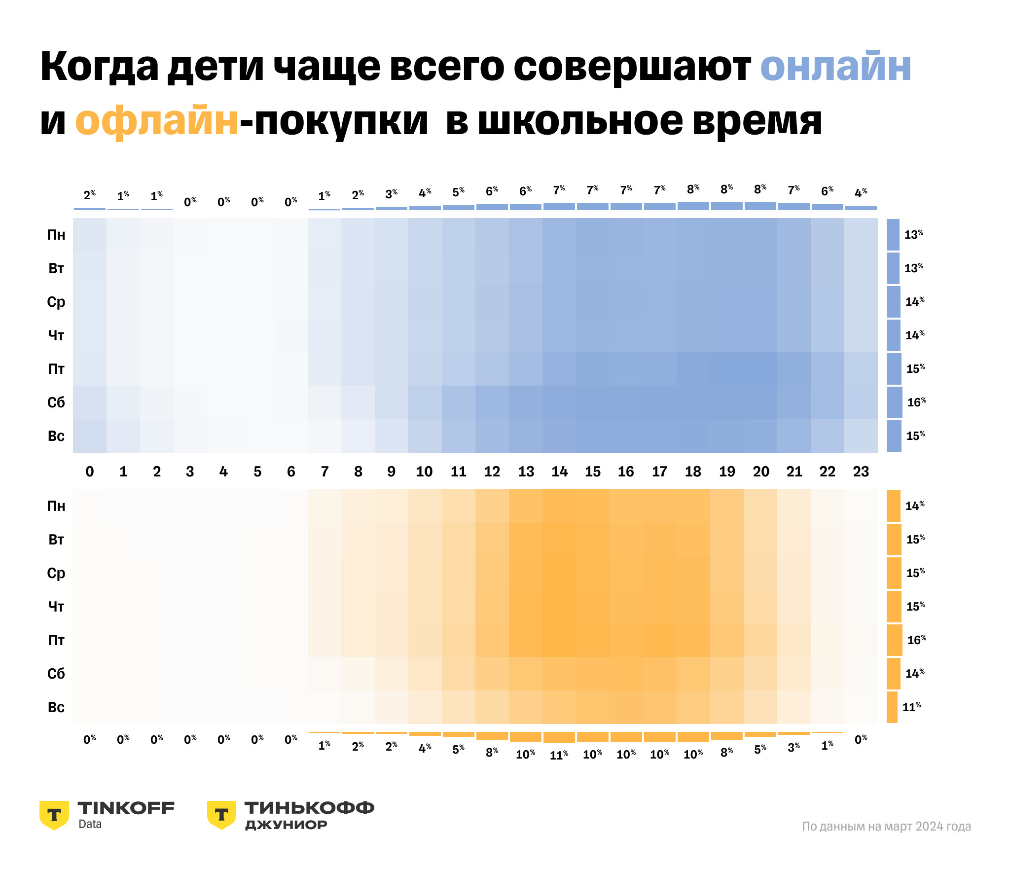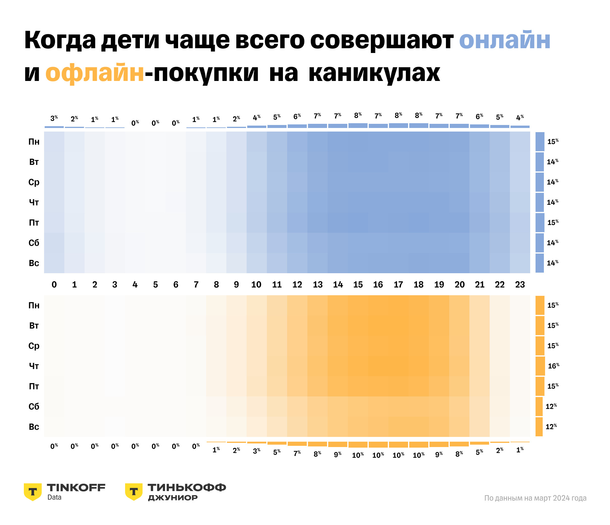 По данным за март 2024 года, чаще всего дети оплачивают покупки онлайн в таких городах, как Москва (доля онлайн-покупок составляет 17% от общего объема покупок), Самара (14%), Санкт-Петербург (14%), Нижний Новгород (12%), Уфа (12%). Большая часть транзакций при использовании детских карт приходится на покупки в офлайне. Только 12% транзакций происходят в онлайне в марте (у россиян в среднем 19% покупок в онлайне). Такой процент онлайн-покупок у детей может быть связан с тем, что родители ограничивают своему ребенку оплату в интернете из-за возможных импульсивных покупок. Во время учебы пользователи детских карт совершают в офлайне покупки по картам чаще, чем в выходные. При этом чем ближе к выходным — тем чаще дети тратят денежные средства: на понедельник приходится 14% покупок в офлайне, а на пятницу — 15,9%. Большая доля покупок в будни в учебное время — в районе 14:00. Заметная транзакционная активность в будни обычно наблюдается с 7 утра до 10 вечера.В субботу совершают 13,5% офлайн-покупок за неделю, активнее всего покупки совершают с 14:00 до 17:00. А в воскресенье дети делают 11,4% офлайн-покупок, причем больше всего — после 15:00. Заметная транзакционная активность в выходные обычно с 8 утра (на час позже, чем в будни) и до 10 вечера. В каникулы и выходные чаще всего проводят вместе с родителями — поэтому дети совершают покупки реже, чем в будни. Самый активный с точки зрения онлайн-покупок день у детей в каникулы — пятница (14,9%).По месяцам пик трат у них всегда приходится на август. Для покупок в онлайне распределение по времени более равномерно в течение дня — активно дети пользуются картой с 6-7 утра до 1-2 ночи. Существенных различий между учебным временем и каникулами также нет, но в каникулы школьники немного больше закупаются в онлайне по ночам.