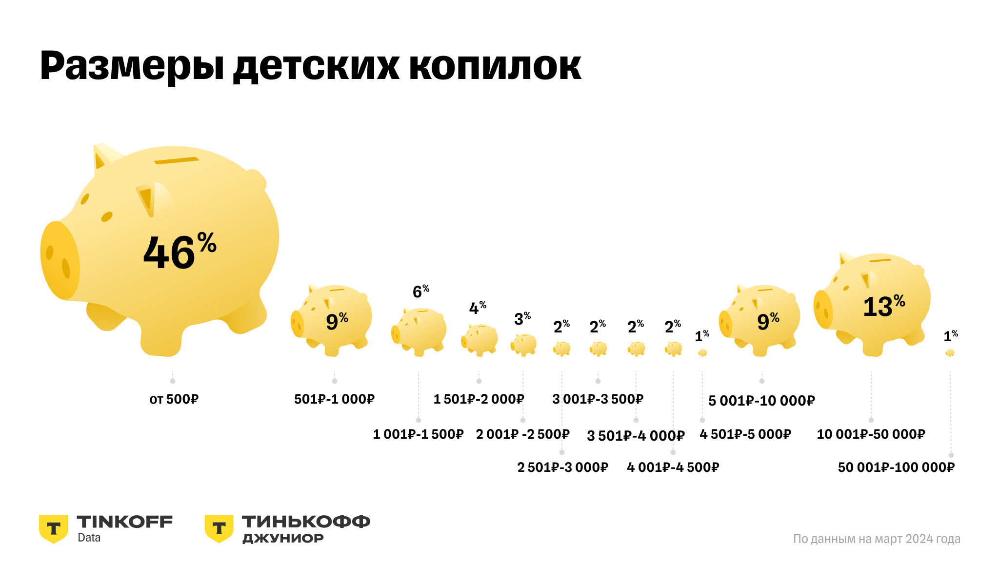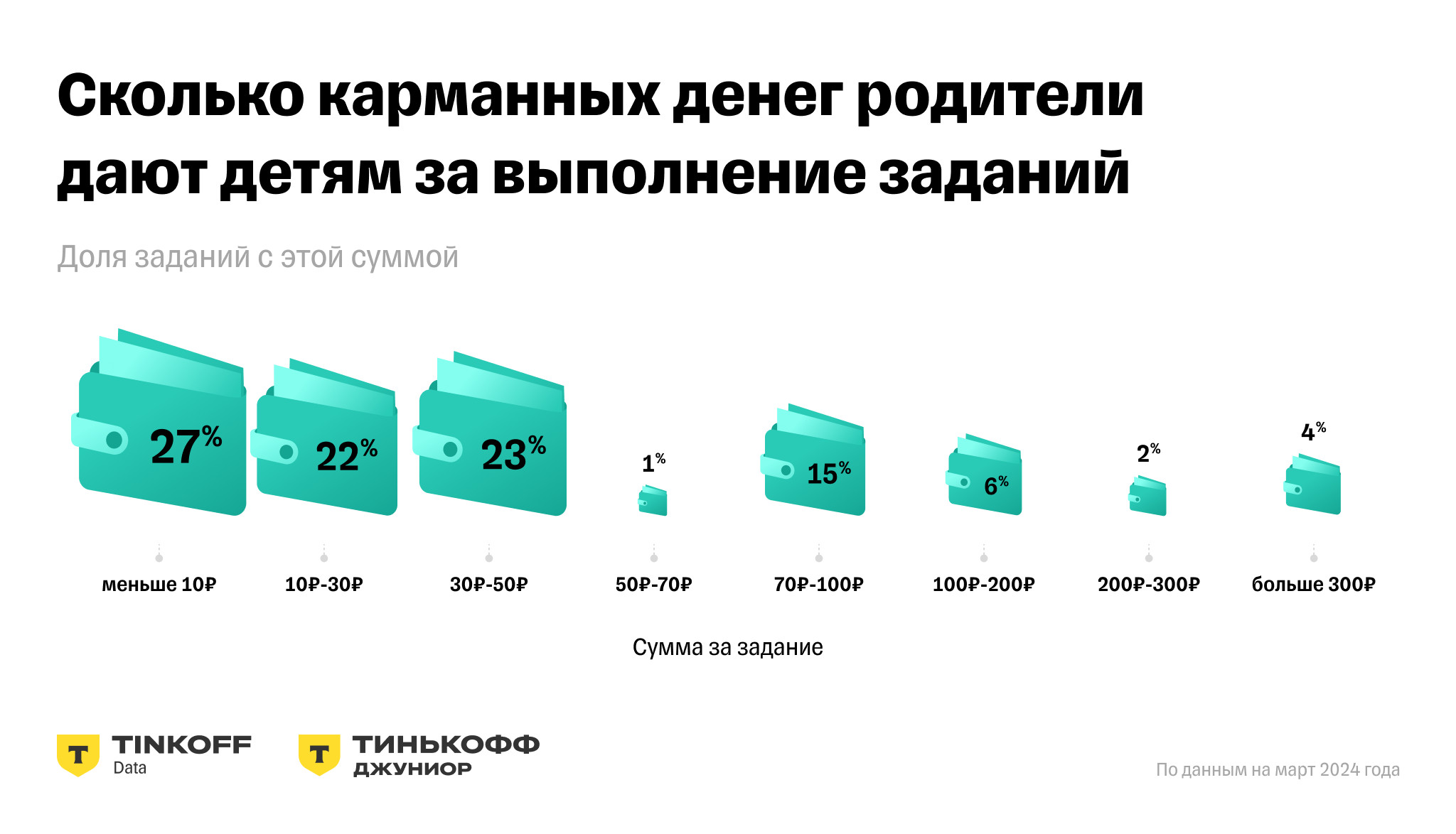 Однако сумма, которые есть на детских копилках, зачастую далека от цели. В 46% детских копилок лежит сумма меньше 500 рублей, еще на 9% — от 500 до 1 тыс. рублей. Но есть и более целеустремленные дети: у 9% в копилке от 5 тыс. до 10 тыс. рублей, а у 13% — от 10 тыс. до 50 тыс. рублей. Больше 50 тыс. рублей в копилке у 1% детей. Родители не только переводят детям деньги на карту, но и дают различные задания — убрать в комнате, вынести мусор, помыть посуду, погулять с собакой, полить цветы и т.д. С помощью детских карт родители чаще всего хотят приучить детей к домашним делам. Сумма, которую ребенок получает за успешно выполненное задание, в среднем составляет 89 рублей. По данным исследования, за выполнение 71,9% заданий дети в среднем получают до 50 рублей. За 27,2% заданий родители дают детям до 10 рублей, за 16,1% заданий — от 50 до 100 рублей. На задания дороже 100 рублей приходится 12% (3,6% — задания стоимостью более 300 рублей).