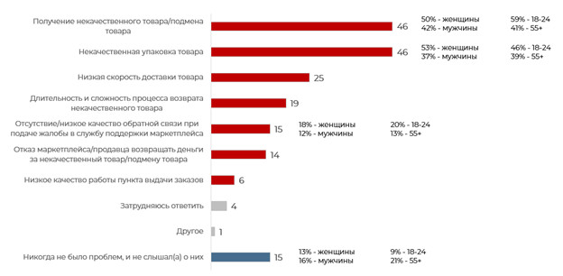 1. Потребители, регулярно совершающие покупки на маркетплейсах, выделяют у электронных торговых площадок ряд преимуществ — в первую очередь экономию средств, времени и сил. Однако фиксируется проблема контроля качества товара и его соответствия описанию. Опыт получения некачественного товара или подмены товара так или иначе имеет большинство покупателей на маркетплейсах: 75% опрошенных отметили, что они сами или их знакомые сталкивались с этим.