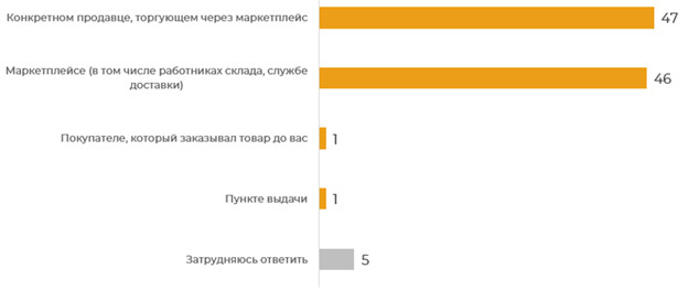 2. Ответственность за качество возлагается практически в равной мере на продавцов (47%) и на сами маркетплейсы (46%), незначительная доля респондентов считает, что ответственность лежит на пункте выдачи (1%) и на покупателе, который ранее заказывал товар и вернул его обратно (1%), затруднились ответить — 5%. При этом вызывают поддержку решения, которые повышали бы защищенность потребителей, — большой выбор поставщиков, их частая смена при отсутствии сервиса оценки качества создает для потребителя дополнительные риски.