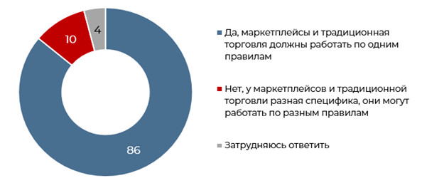 3. Опрошенные уверены, что в вопросе защиты прав потребителей маркетплейсы и традиционные магазины должны подчиняться одним и тем же правилам (86% за, 10% против, 4% затруднились).