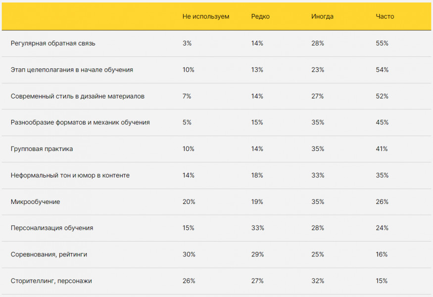 Для максимальной эффективности образования необходимо обеспечить сотрудникам возможность общения и обмена опытом. Это подтверждается тем, что 41% компаний, участвовавших в исследовании, регулярно применяют групповые занятия в своих программах обучения. Даже автоматизированные учебные программы не могут обойтись без человеческого присутствия, поскольку поддержка играет ключевую роль при освоении новых навыков. Об этом свидетельствует пример использования программы True Education в компании МТС: наличие живого куратора, активная деятельность в телеграм-канале и доступная подача материалов позволили достичь индекса потребительской лояльности (NPS) в 9.1.