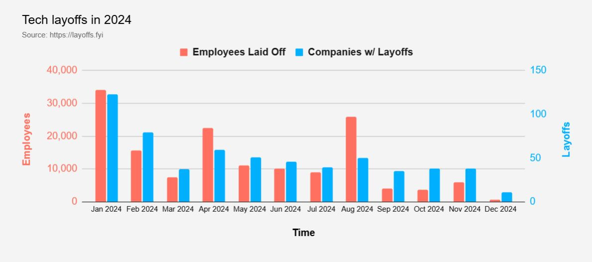 В 2024 году без работы остались около 150 тысяч IT-специалистов. Об этом говорят данные исследования, проведенного независимым трекером увольнений Layoffs.fyi.
