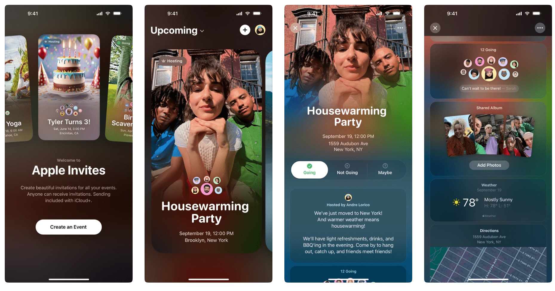 Invites автоматически добавляет в приглашение информацию из сервисов «Карты» и «Погода». Приглашение отправляется гостю в виде ссылки. Подтвердить участие можно через iPhone с установленным Invites или через браузер с любого устройства.