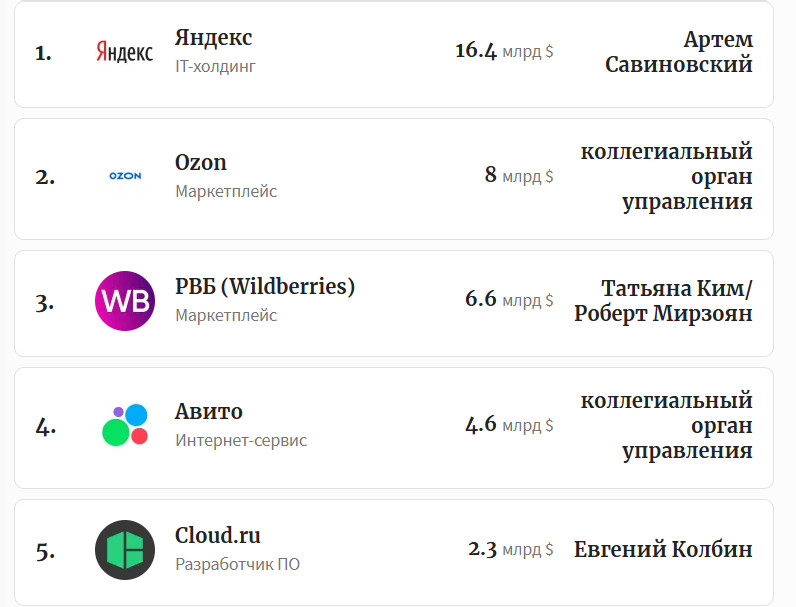 Итак, первую строчку рейтинга занял Яндекс стоимостью $16 400 млн. На втором месте оказался Ozon стоимостью $8000 млн. На третьей позиции — РВБ (Wildberries). Четвертое место занял Авито. Замыкает пятерку лидеров разработчик ПО Cloud.ru.