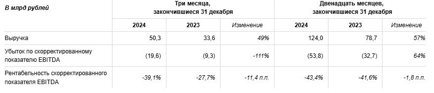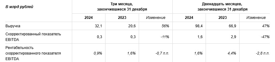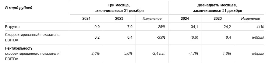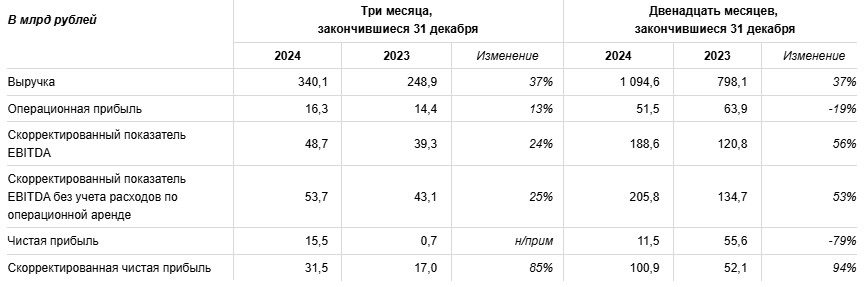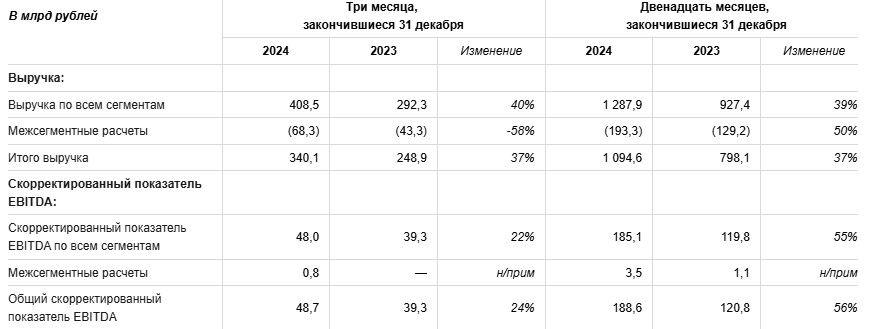 - Выручка за 2024 год выросла на 37% год к году и составила 1 094,6 млрд рублей.
