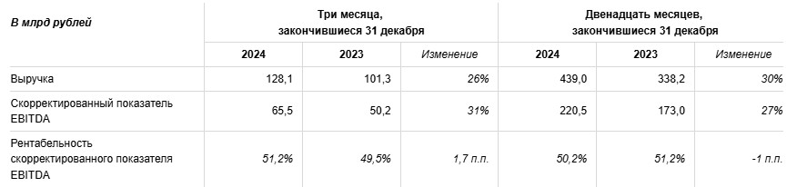 - Рост выручки в четвертом квартале 2024 года ускорился на 1,1 п. п. относительно третьего квартала 2024 года и составил 37%.