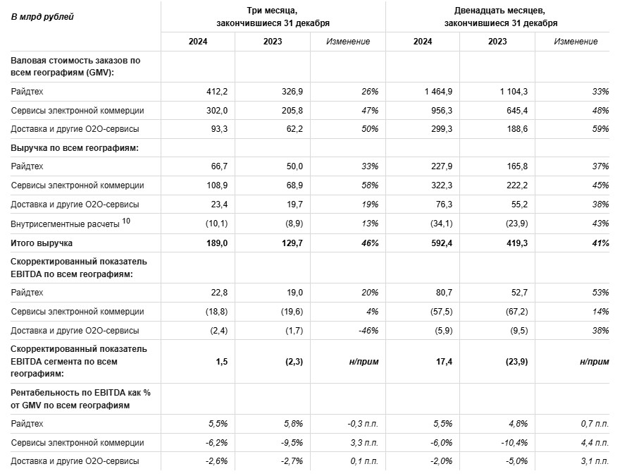 Компания прогнозирует рост выручки в 2025 году более 30% год к году и скорректированный показатель EBITDA не менее 250 млрд рублей. С учетом роста масштаба бизнеса, капитальные затраты как процент от консолидированной выручки Группы снизятся год к году. Этот прогноз основан на наблюдаемых в данный момент рыночных тенденциях, и может измениться в зависимости от макроэкономической и рыночной ситуаций. 20 февраля 2025 года в 13:00 по московскому времени менеджмент компании проведет онлайн-звонок, посвященный финансовым результатам Яндекса за четвертый квартал 2024 года. Подключиться и задать вопросы можно, зарегистрировавшись по ссылке. Обзор ключевых консолидированных финансовых показателей за три и двенадцать месяцев, закончившихся 31 декабря 2024 и 2023 годов. Остаток денежных средств, денежных эквивалентов и краткосрочных депозитов на 31 декабря 2024 года: Поиск и портал Данный сегмент включает Поиск, Геосервисы, Браузер и ряд других сервисов по предоставлению информационных услуг. Ключевые операционные и финансовые показатели за четвертый квартал 2024 года: Электронная коммерция, Райдтех и Доставка В этот сегмент входят транзакционные О2О-сервисы, позволяющие совершать покупки онлайн, а также получать товары или услуги в офлайн-форматах: 1. Райдтех, который включает сервис онлайн-заказа такси и дистрибуцию таких технологий за рубежом, сервис каршеринга Яндекс Драйв, сервис аренды самокатов, а также другие перспективные сервисы. 2. Электронная коммерция включает мультикатегорийную торговую платформу Яндекс Маркет, сервис гиперлокальной доставки продуктов и товаров Яндекс Лавка, а также сервисы доставки товаров из магазинов и заказов из ресторанов Яндекс Еда и Деливери. 3. Доставка и другие O2O-сервисы включают Яндекс Доставку — сервис доставки средней и последней мили, сервис для оплаты топлива на АЗС Яндекс Заправки, а также несколько небольших экспериментальных O2O-сервисов. Ключевые операционные и финансовые показатели по всем географиям за четвертый квартал 2024 года: Плюс и развлекательные сервисы В этот сегмент входят единая подписка на сервисы Яндекса — Яндекс Плюс, Яндекс Музыка, Кинопоиск, Яндекс Книги (сервис, ранее известный как Букмейт), а также Яндекс Афиша и продюсерский центр Плюс Студия. Ключевые операционные и финансовые показатели за четвертый квартал 2024 года: Сервисы объявлений В этот сегмент входят Авто.ру, Яндекс Недвижимость, Яндекс Аренда и Яндекс Путешествия. Ключевые операционные и финансовые показатели за четвертый квартал 2024 года: Прочие бизнес-юниты и инициативы Данная категория включает направление автономного транспорта Yandex SDG, облачные сервисы Yandex Cloud и Яндекс 360, Яндекс Практикум и другие образовательные инициативы, Устройства и Алису, Финтех и другие экспериментальные продукты, а также общехозяйственные расходы, не относящиеся к сегментам напрямую. Межсегментные расчеты Межсегментные расчеты представляют собой элиминируемые обороты между операционными сегментами, включая доходы от рекламы и межсегментные доходы, связанные с выплатами за использование товарного знака и виртуальных серверов, а также с продажами устройств и другими операциями. Межсегментные расчеты в выручке за четвертый квартал 2024 года увеличились на 58% по сравнению с аналогичным показателем за четвертый квартал 2023 года, что обу