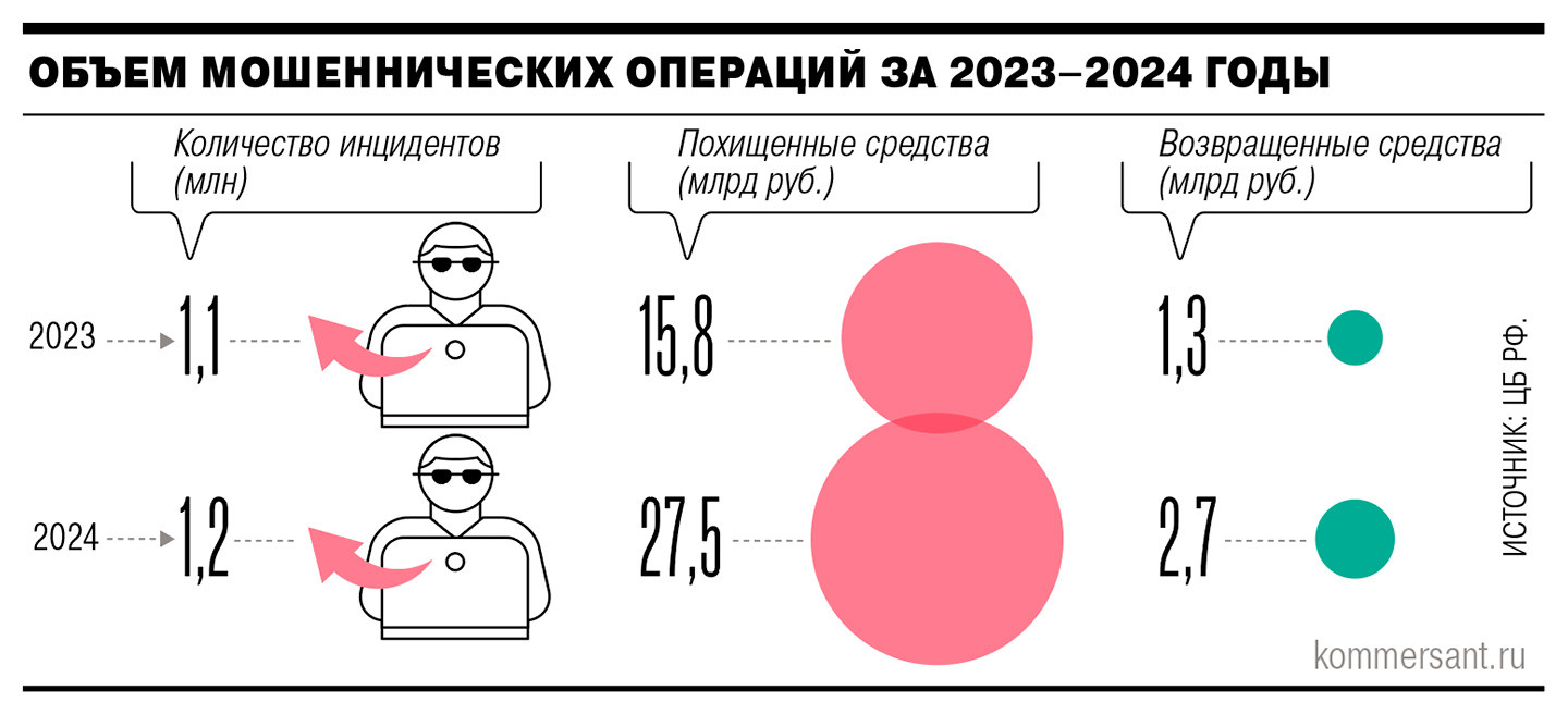 Согласно данным ЦБ, в 2024 году злоумышленники похитили со счетов россиян на 74,4% больше средств, чем в 2023-м. Само же количество мошеннических переводов увеличилось на 2,7%, до 1,2 млн операций.