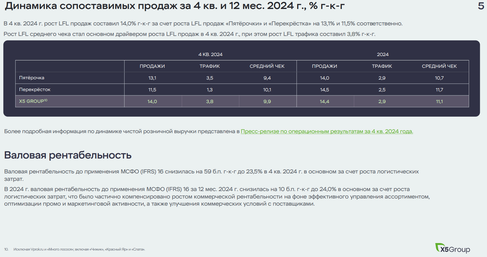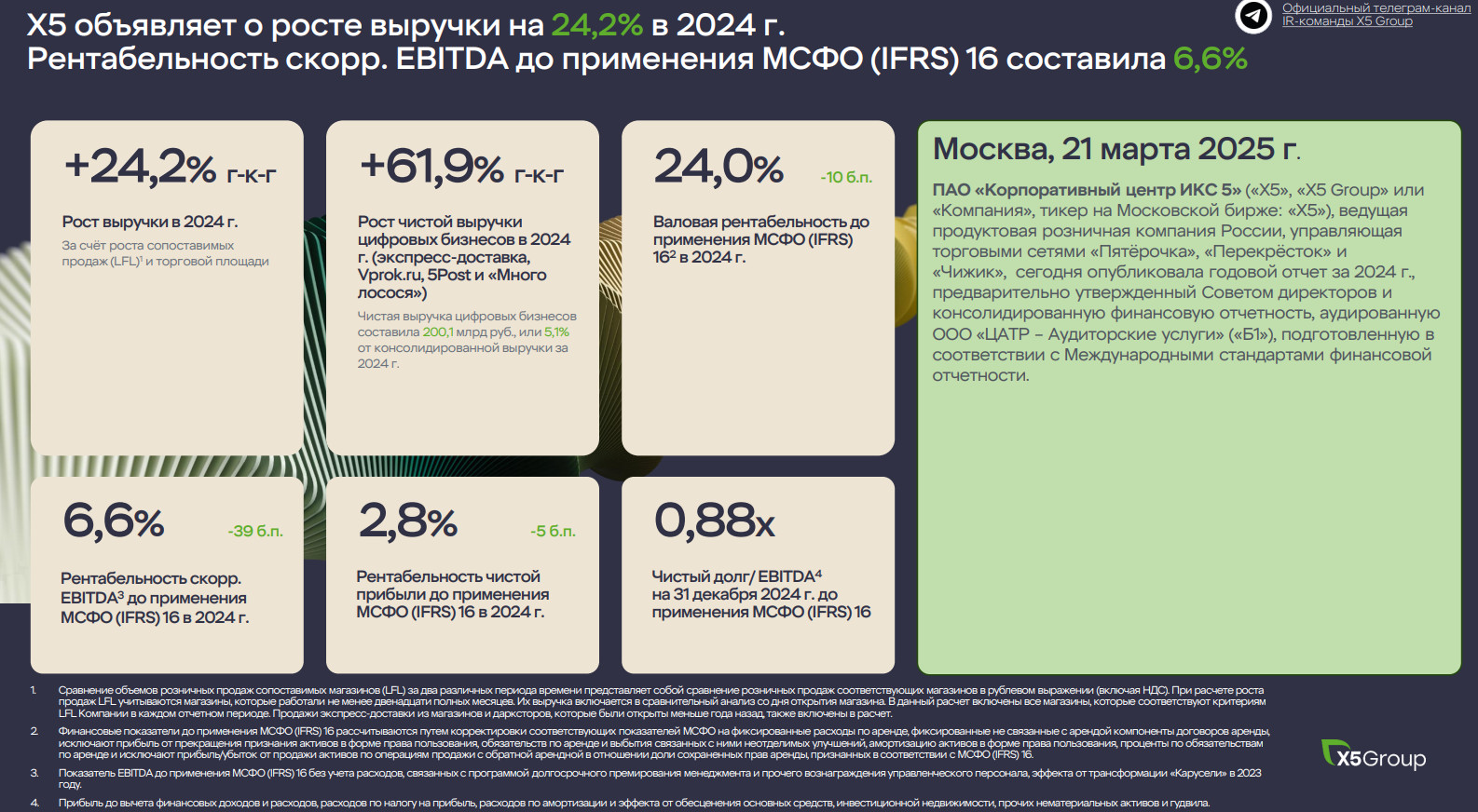X5 Group («X5», тикер на Московской бирже — X5) — ведущая российская продуктовая розничная компания, которая управляет магазинами нескольких торговых сетей: магазинами «у дома» «Пятёрочка», супермаркетами «Перекрёсток» и «жёсткими» дискаунтерами «Чижик». X5 занимает лидирующие позиции в e-commerce, развивая цифровые бизнесы Vprok.ru, 5Post, экспресс-доставку и «Много лосося».