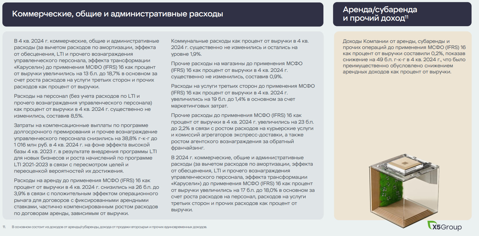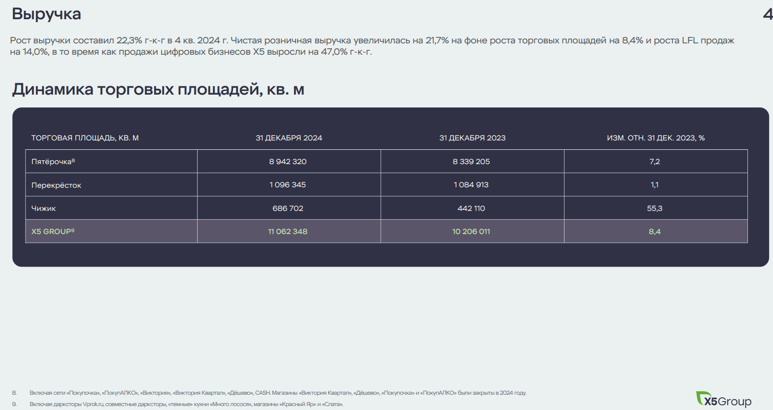 На 31 декабря 2024 года под управлением X5 находилось 27 015 магазинов (22 976* «Пятёрочек», 986 «Перекрёстков», 2 346 «Чижиков» и 612 магазинов «Красный Яр» и «Слата»), а также 71 распределительный центр и 6 981 собственный грузовой автомобиль на территории Российской Федерации.