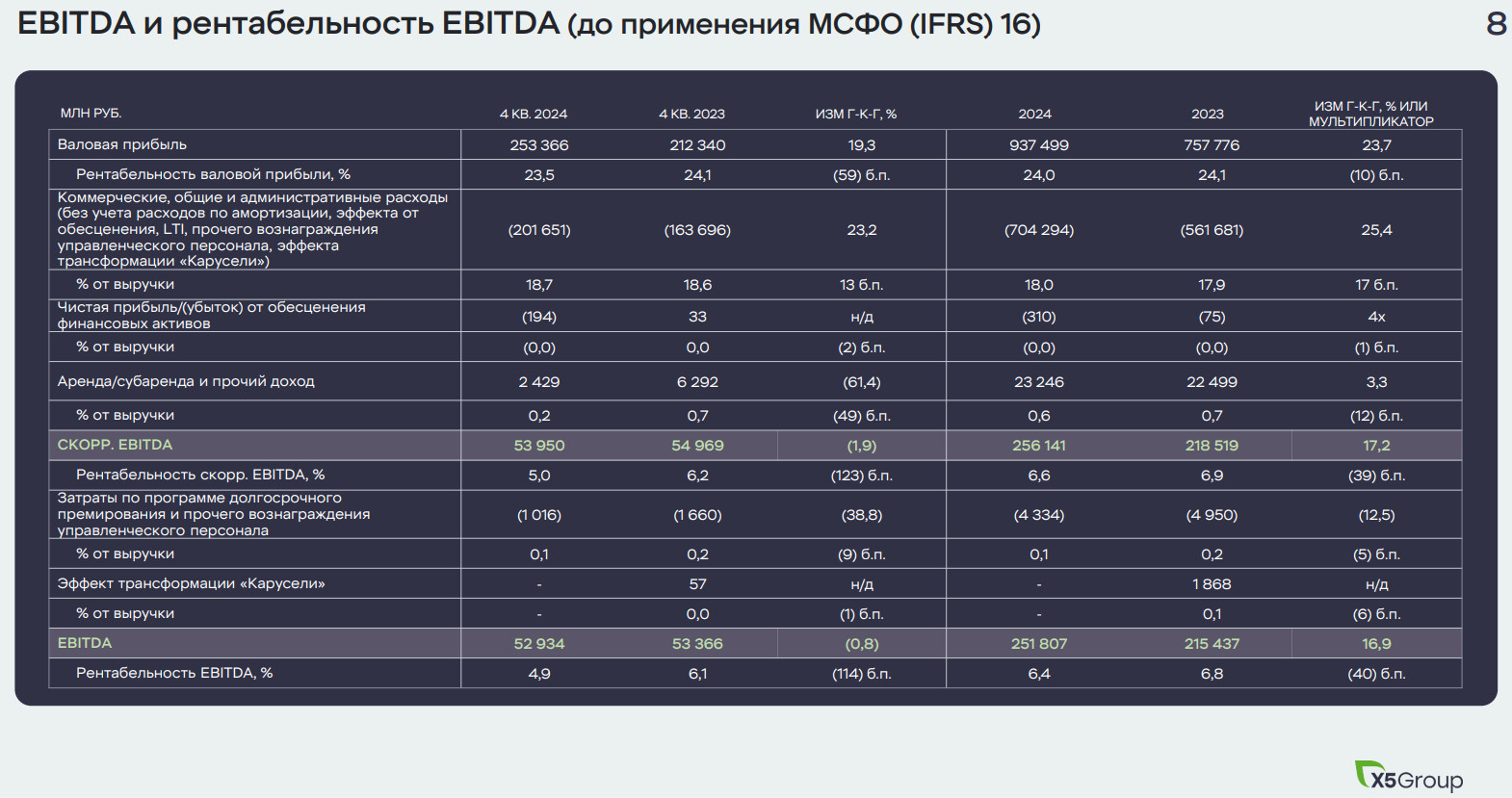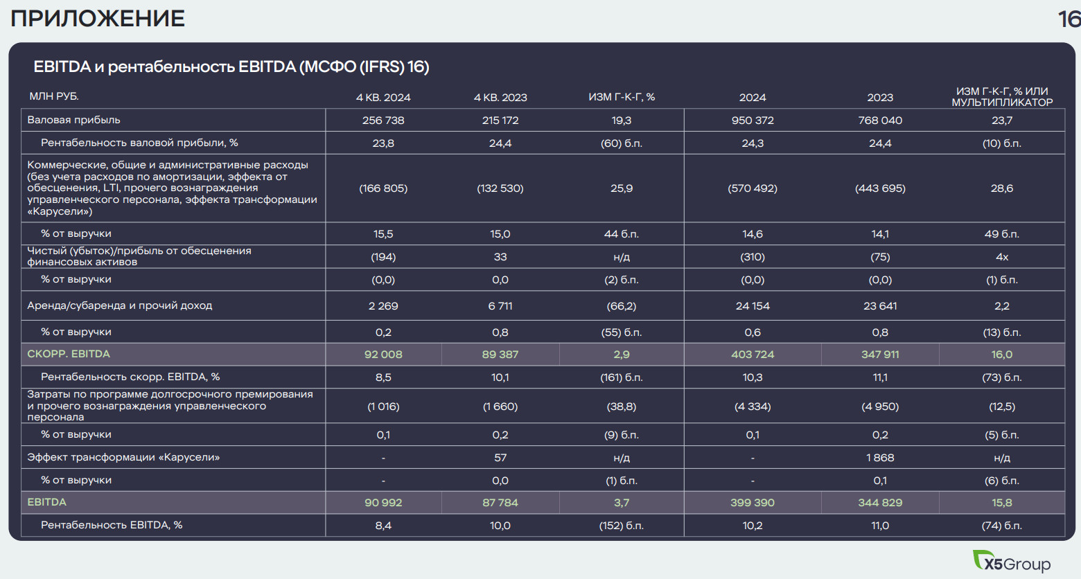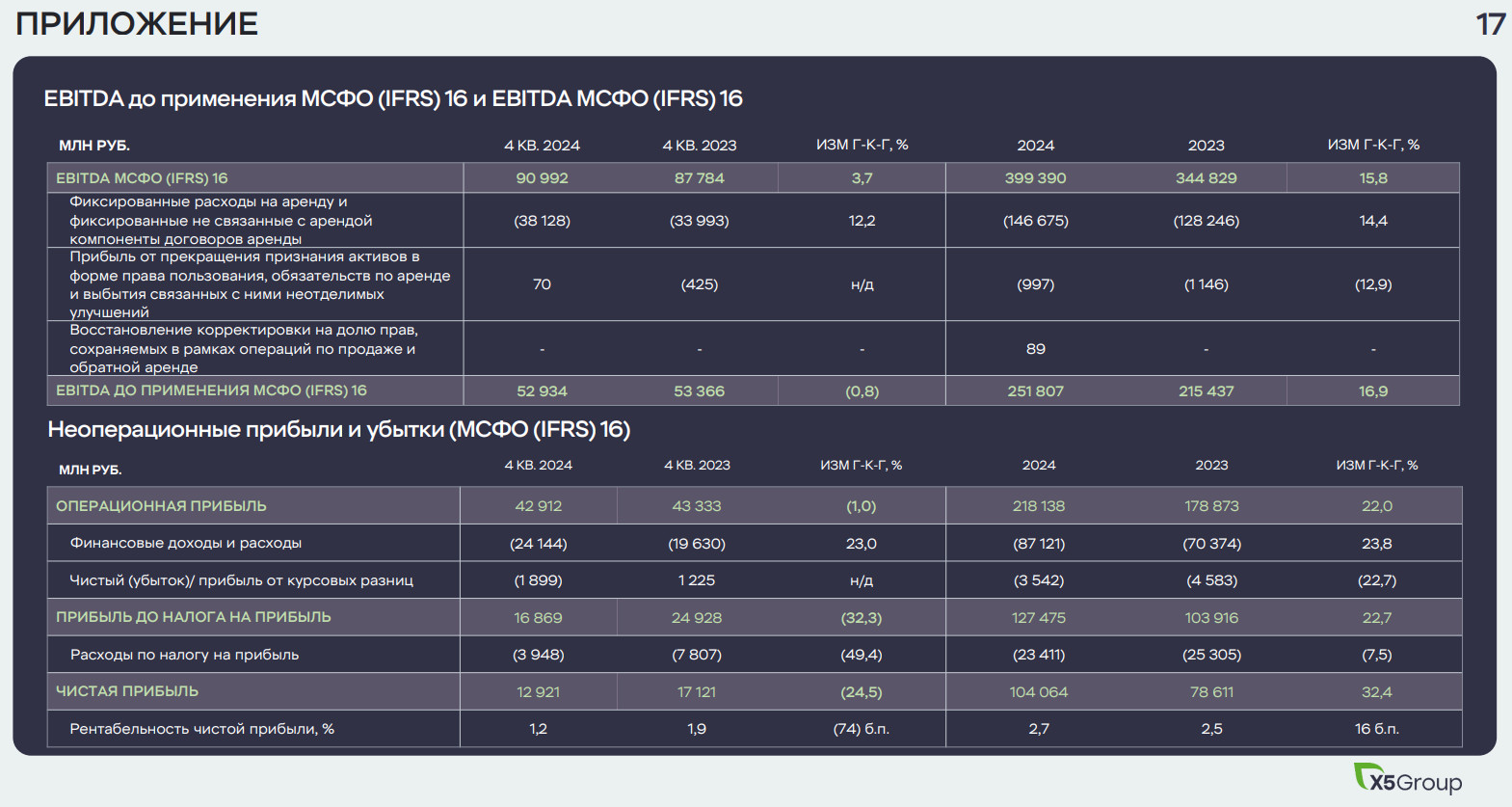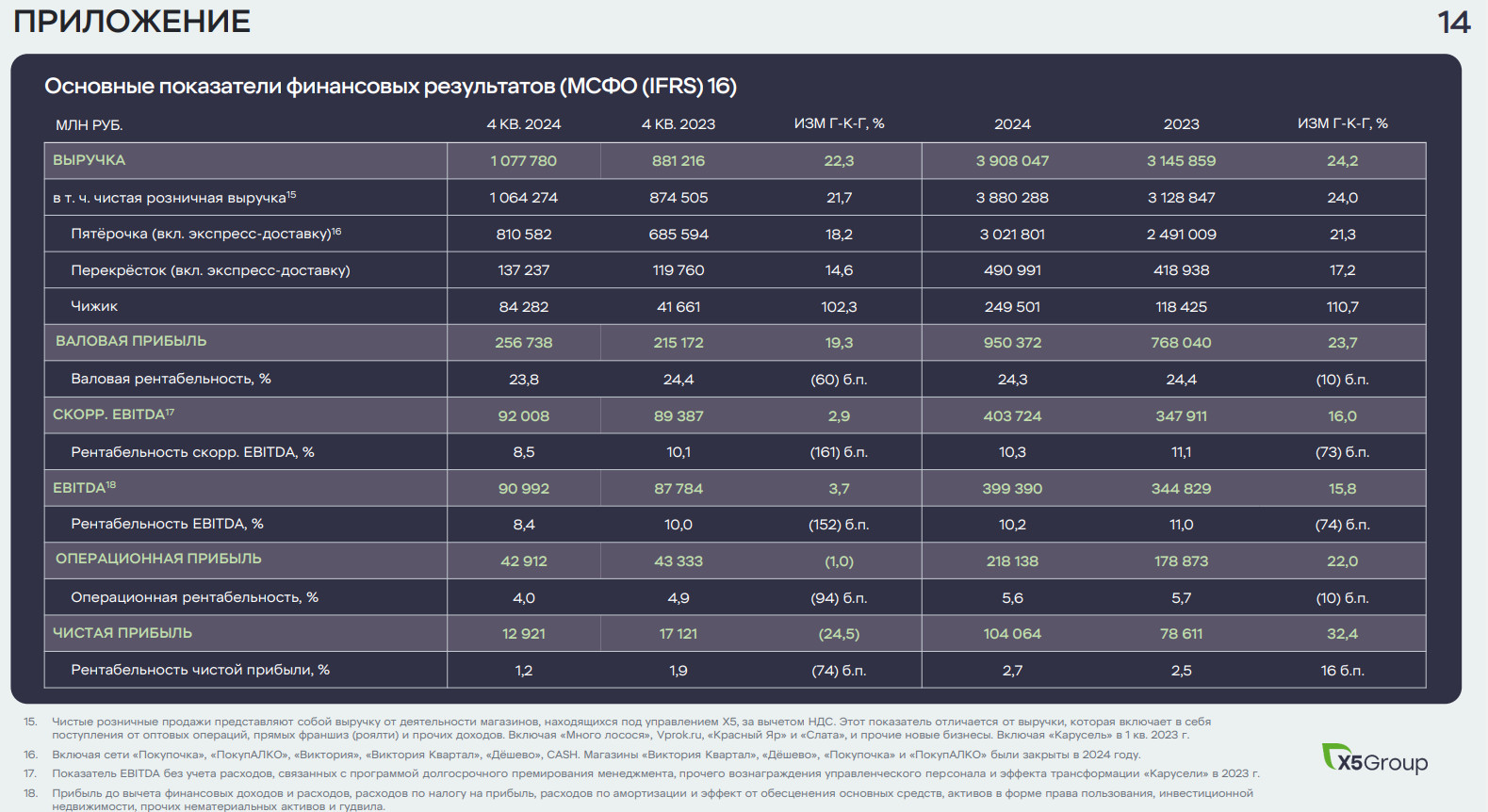 Выручка компании за 2024 год составила 3 908 047 млн руб., EBITDA до применения МСФО (IFRS) 16 составила 251 807 млн руб., а чистая прибыль до применения МСФО (IFRS) 16 составила 110 091 млн руб.