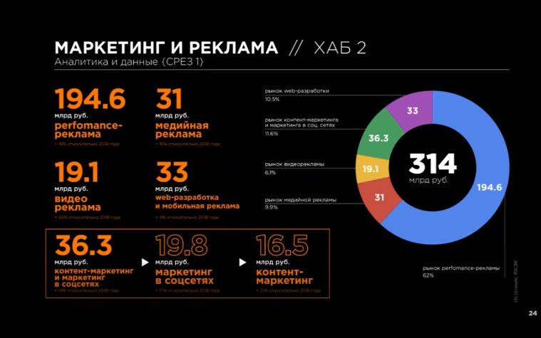 Значительные объемы также сохраняются в видеорекламе (284,8 млрд рублей) и наружной рекламе (97,1 млрд рублей). На издательский бизнес и аудиорекламу приходится 27 млрд рублей и 24,6 млрд рублей соответственно".