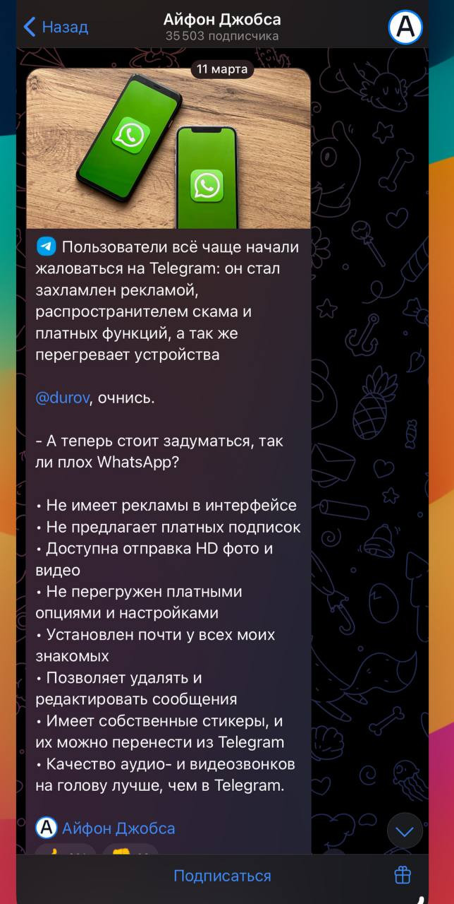 «Лучше бы потратили миллиарды на инновации»: Дуров высмеял WhatsApp за рекламу в Telegram-каналах