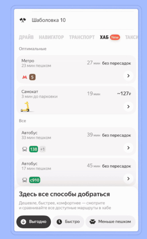 Этот сервис объединяет общественный транспорт, такси, каршеринг и самокаты в одном окне. Система автоматически рассчитывает маршруты с учётом времени в пути, пробок, количества пересадок, расстояния и стоимости. Пользователь может задать предпочтения — например, выбрать самые быстрые, дешёвые или маршруты с минимальным количеством пеших участков.