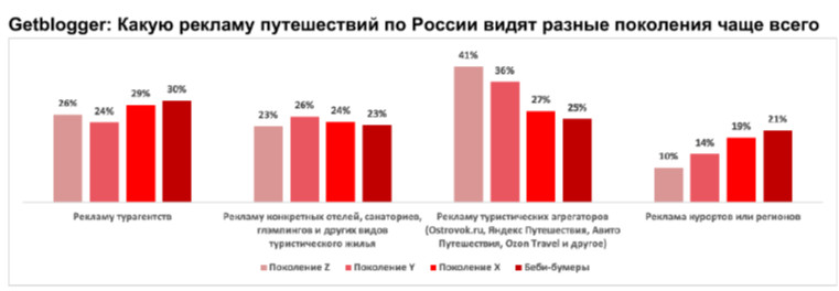 Представители поколения Z чаще, чем другие возрастные группы, замечают рекламу туристических агрегаторов, в то время как Беби-Бумеры — рекламу курортов или отдельных регионов.