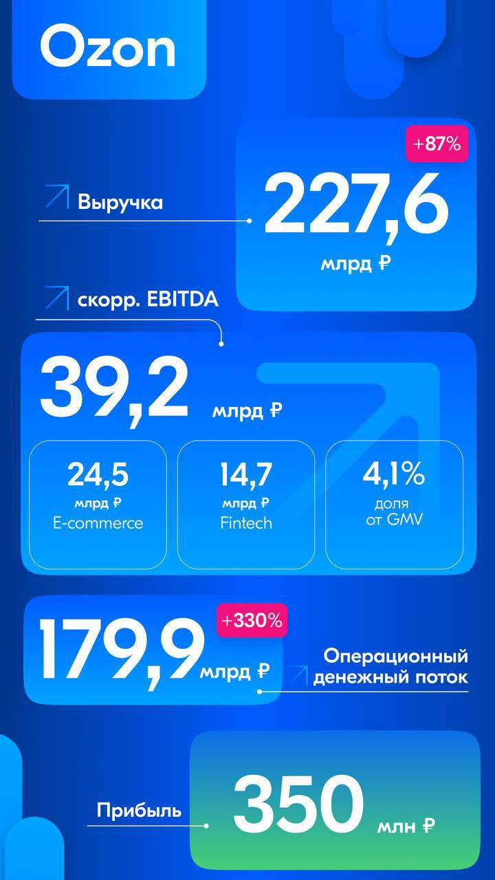 Все показатели оказались лучше консенсус-прогноза «Интерфакса». Ранее опрошенные аналитики ожидали, что GMV Ozon составит 906,5 млрд рублей, а скорр. EBITDA — 28,7 млрд рублей. Выручка, согласно прогнозу, ожидалась в размере 208,6 млрд рублей.