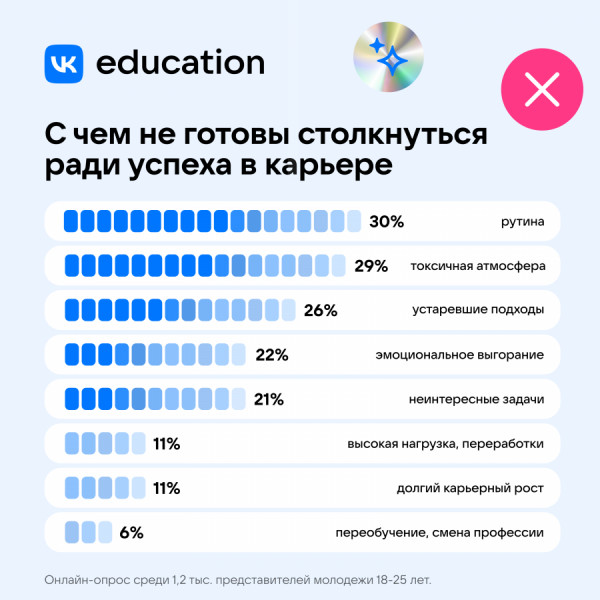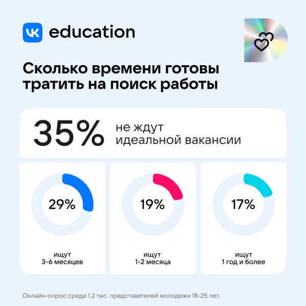 21% респондентов уверены, что специалист будущего обладает высшим образованием, но при этом постоянно учится и совершенствуется. Такой специалист не ограничивается одной узкой специализацией (19%), проявляет инициативность (14%), способен решать сложные задачи (11%) и высоко ценит командную работу (8%). 28% зумеров готовы начать обучение, если их друзья или знакомые уже освоили этот навык. Столько же респондентов проходят обучение из личного интереса или для творческого самовыражения. Основными факторами при выборе обучения являются: польза для карьеры и повышения дохода (25%), востребованность навыка на рынке труда (23%), страховка на случай смены профессиональной деятельности (13%) и соответствие требованиям работодателя (12%). На пути к карьерным успехам опрошенные не готовы мириться с однообразием (30%), нездоровой атмосферой в коллективе (29%), устаревшими методами работы (26%), риском эмоционального истощения (22%) и неинтересными задачами (21%). Более терпимо они относятся к переработкам и высокой рабочей нагрузке (11%), медленному продвижению по карьерной лестнице (11%) и необходимости переквалификации или смены профессии (6%). При поиске работы 35% опрошенных не стремятся к «идеальной» вакансии, для них важно, чтобы условия были приемлемыми. 29% готовы посвятить поиску работы от 3 до 6 месяцев, активно откликаясь на различные предложения, 19% находят работу за 1-2 месяца, даже если она не полностью отвечает их ожиданиям. 17% ищут работу год и более, чтобы найти наиболее подходящий вариант.