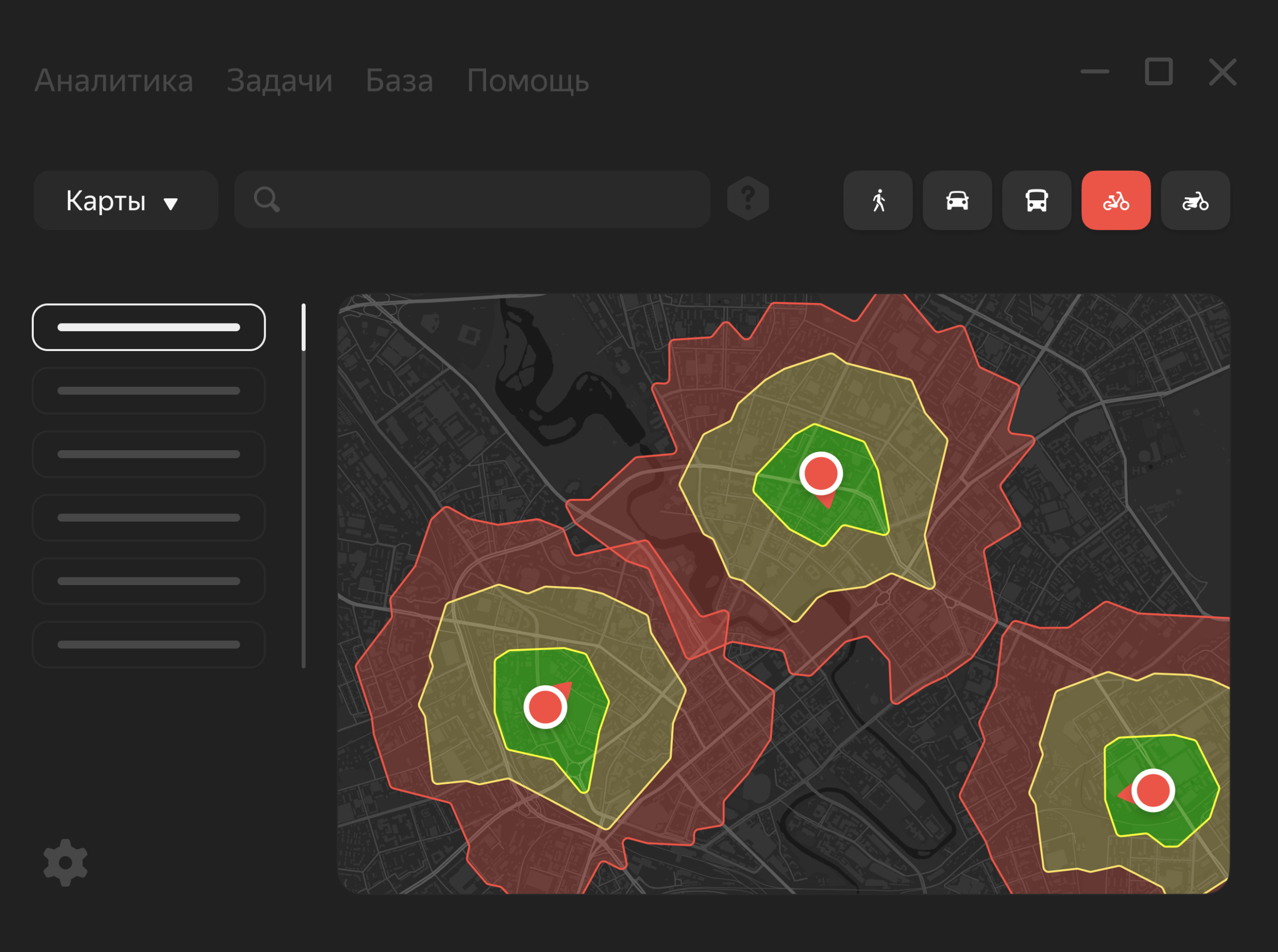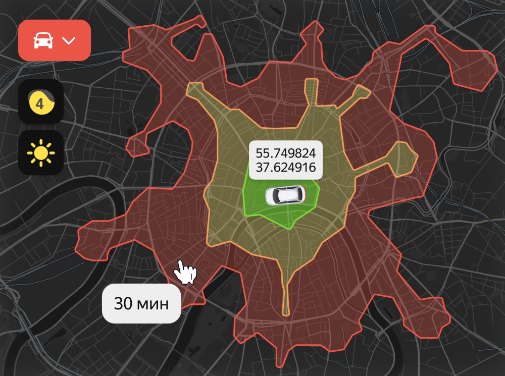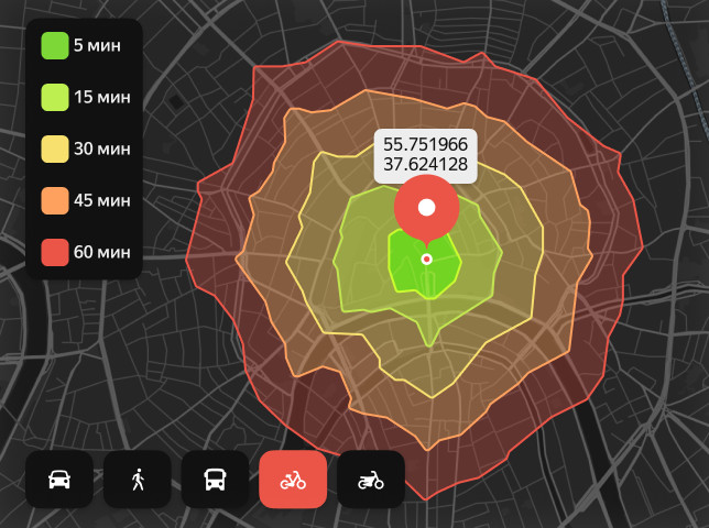 Изохрон API учитывает разные способы передвижения: на автомобиле, велосипеде, общественном транспорте, самокате или пешком. Чтобы построить границы доступной зоны, достаточно указать начальную точку и выбрать подходящий временной интервал — 5, 10, 15 минут и так далее. Для автомобилей доступна зона в пределах часа, для остальных способов передвижения — до 45 минут. Сервис учитывает пробки, прогноз погоды и адаптирует зоны доставки под изменения ситуации на дорогах.