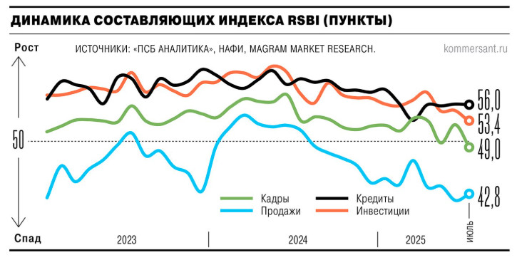 Индекс RSBI составил пороговые 50 пунктов, разделяющих зоны оптимизма и пессимизма в настроениях предпринимателей. Индекс PMI сферы услуг России в июле 2025 года также упал.