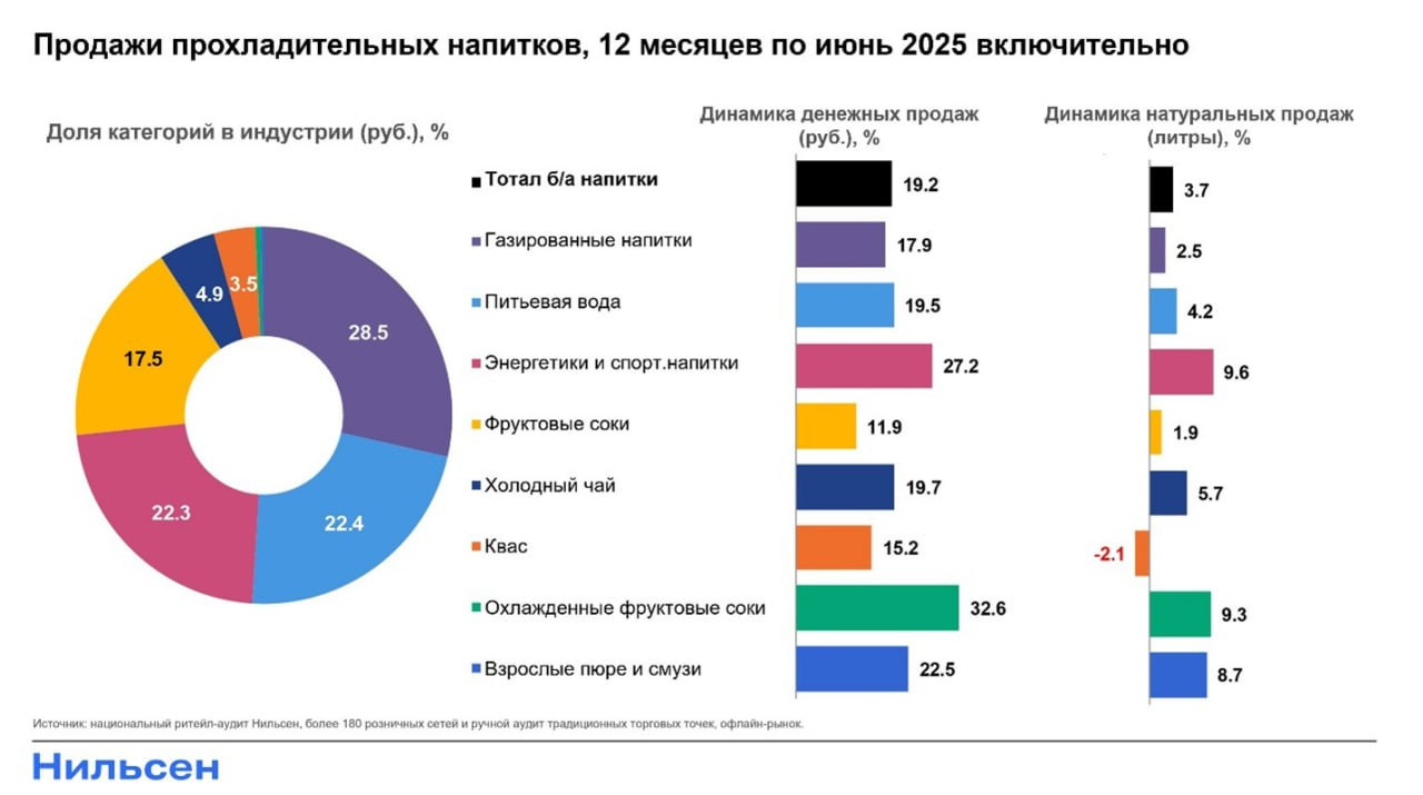 В июле розничные продажи энергетиков в России в натуральном выражении выросли на 7% год к году, в денежном — на 20%, подсчитали в «Эвотор» (разработчик кассового ПО). С начала года темпы роста существенно замедлились. В январе рост натуральных продаж энергетиков оценивался в 24% год к году, денежных — в 38%. Директор по аналитике NTech Леонид Ардалионов говорит, что в марте—мае 2025 года натуральные продажи в категории увеличились на 5,6% год к году, в предыдущие три месяца рост составлял 19,8%.