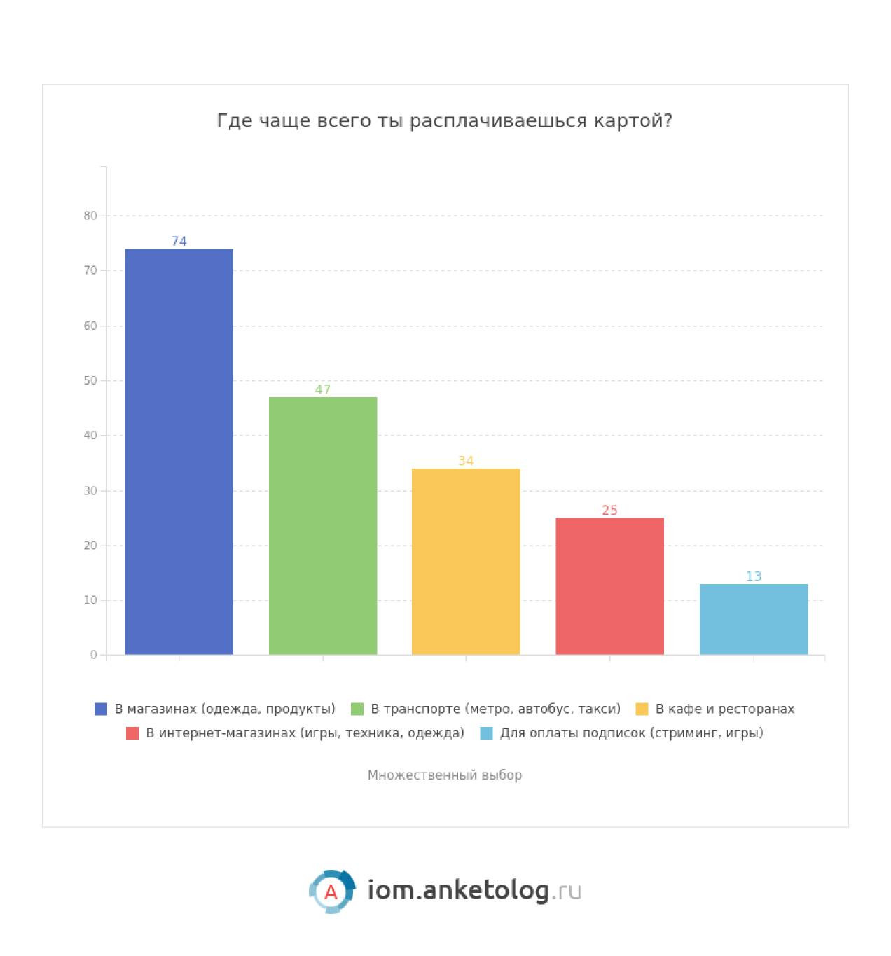 В повседневных расчетах школьники чаще всего прибегают к использованию карт в магазинах (74%), оплачивают проезд в общественном транспорте (47%), посещение кафе и ресторанов (34%), совершают покупки в онлайн-магазинах (25%) и оплачивают подписки на различные сервисы (13%).