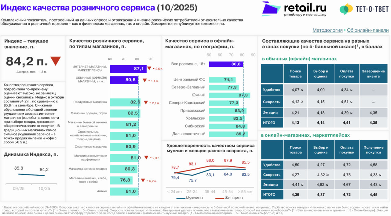 - интернет-магазинам и маркетплейсам (87,1 пункта), где, несмотря на наблюдаемый спад, уровень сервиса остается выше среднего;